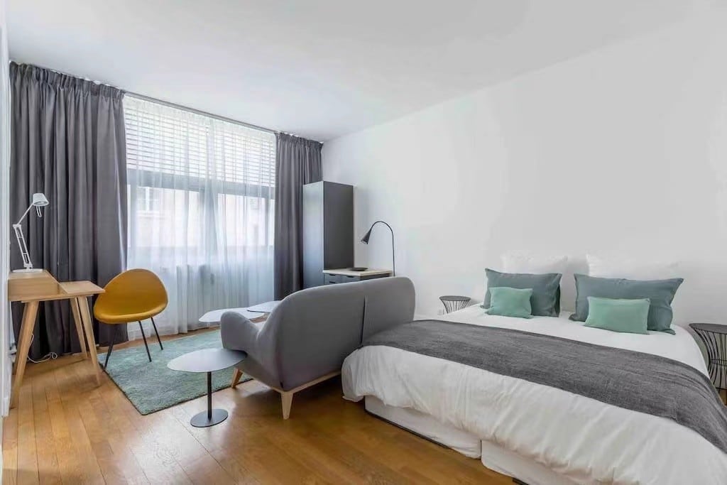 Superb premium flat, fully equiped flat of 36 m2, with lift on the 5 floor and one floor with stair ,US kitchen, with washing machine( can dry only half machine), dishwasher, Nespresso machine, internet, air cond, one bedroom withOne Queen/size bed(1,80x200) and in the living room, a brand new sofa convertible bed(1,70x200)Fully refurbished 2020.