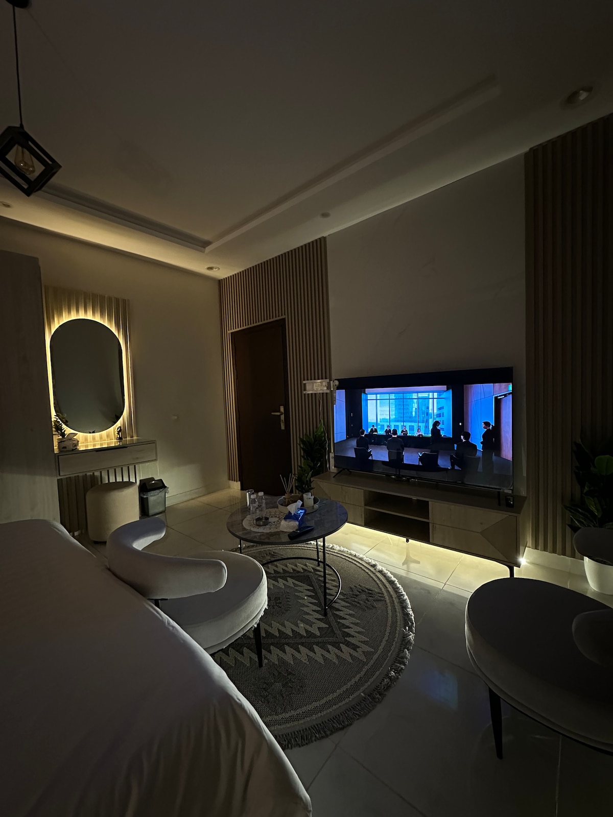 Profitez d'un séjour confortable et moderne dans un appartement de deux chambres au design moderne et équipé de tout ce dont vous avez besoin. L'appartement est idéalement situé sur King Abdulaziz Road, et est : • En échange de temps de conditionnement physique • 5 minutes du centre commercial Radsy • À 7 minutes du front de mer • 12 minutes de l'aéroport L'appartement📺 comprend : • Écran Samsung de 85 po pour une expérience de divertissement de luxe • Laveuse et sécheuse LG • Lave-vaisselle • Micro-ondes et four d'ALBA • Cuisine entièrement équipée ; • Wifi haut débit • Accès intelligent pour plus d'intimité et de flexibilité L'endroit est parfait, combinant confort et emplacement privilégié.