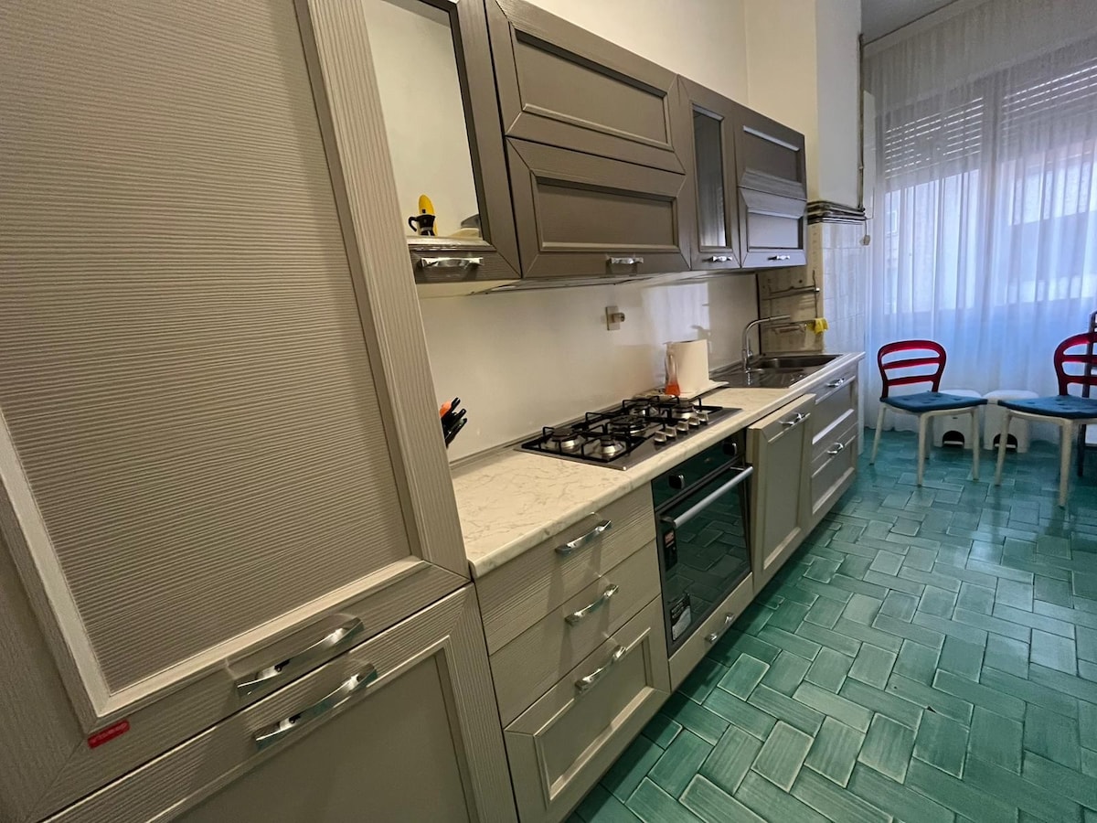 Grazioso bilocale ideale per una coppia in viaggio, o per chi lavora, al secondo piano servito da ascensore, composto da cucina attrezzata di tutto e con lavatrice; camera-soggiorno con letto matrimoniale, divano 3 posti, tv, scrivania, ventilatore a soffitto. 100 m da spiaggia libera con chiosco bevande e doccia; 700 m da stazione ferroviaria, terminal bus; 300 m da zona locali; zona centrale e di passeggio (parco lineare "strada parco"), ampiamente servita da mezzi di trasporto pubblico