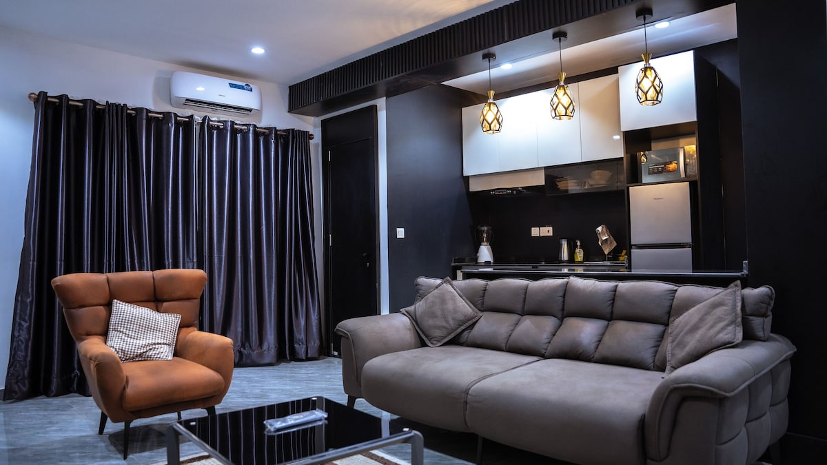 Détendez-vous dans cet appartement d'une chambre calme et design à Jahi, Abuja. Avec ses tons chauds et terreux, son salon confortable, son balcon privé et sa cuisine tout équipée, c'est l'endroit idéal pour les couples, les voyageurs en solo et les télétravailleurs. Profitez d'une connexion Wi-Fi rapide, d'intérieurs élégants et d'une ambiance paisible à quelques minutes de l'agitation de la ville. Votre maison moderne loin de chez vous.
