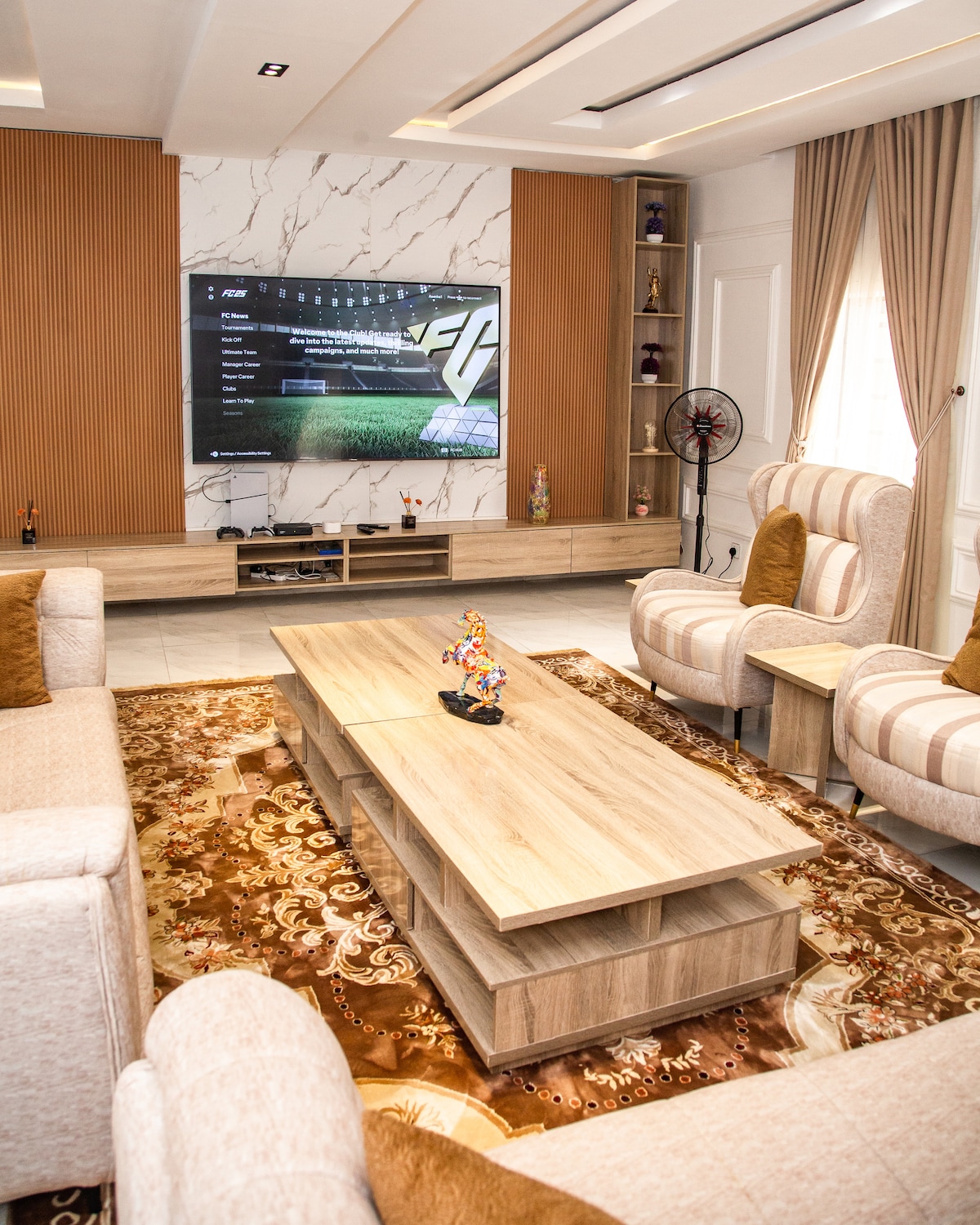 Porte avec code Balcons privés Machine à laver 3 chambres confortables ; 5 climatiseurs Espace de travail Salon meublé Cuisine entièrement équipée 4 toilettes et 3 salles de bain Starlink à haute vitesse Lumière 24h/24 (solaire | Onduleur | Gen) Si pas de réseau électrique : Gen : 6 h-8 h, 18 h-12 h mais onduleur toujours allumé avec climatisation partitionnée. Proximité des marchés, des boîtes de nuit, des restaurants et des magasins Draps et serviettes propres et propres Quartier serein, sécurisé et magnifique Téléviseurs intelligents de 85 po, 65 po, 50 po, 50 po (Prime, Netflix)