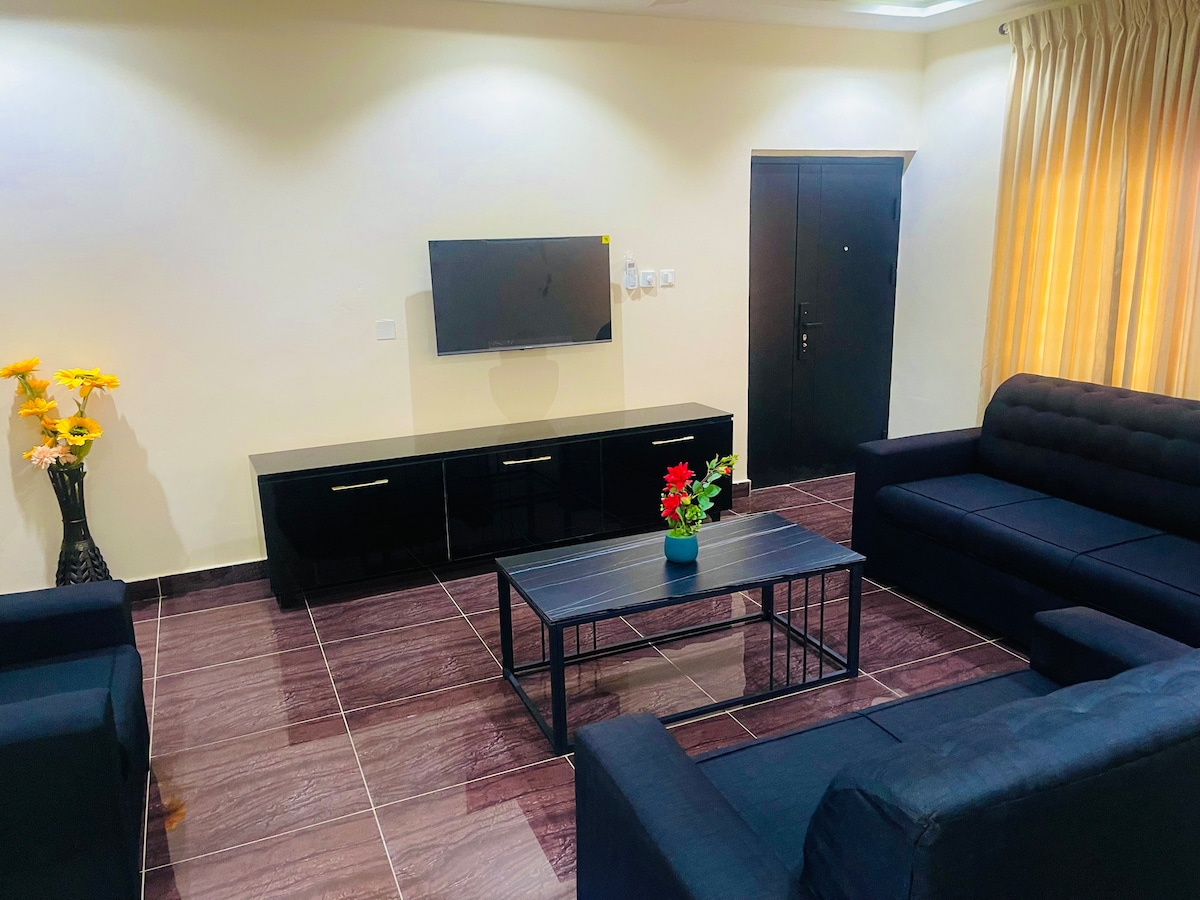 Découvrez l'élégance et le confort modernes de DAV Hills, votre havre de paix urbain, à 5 minutes de Pokuase Interchange, à 10 minutes du centre commercial Achimota et à 40 minutes de l'aéroport international de Kotoka. L'appartement est conçu pour allier style contemporain et commodité ultime. Profitez d'un confort ininterrompu grâce à l'alimentation solaire de secours, à l'eau courante et aux divertissements haut de gamme. Détendez-vous en sachant que vous êtes couvert par une sécurité 24 h/24 et 7 j/7, un stationnement sécurisé sur place et un grand espace pour des événements ou des rassemblements privés.