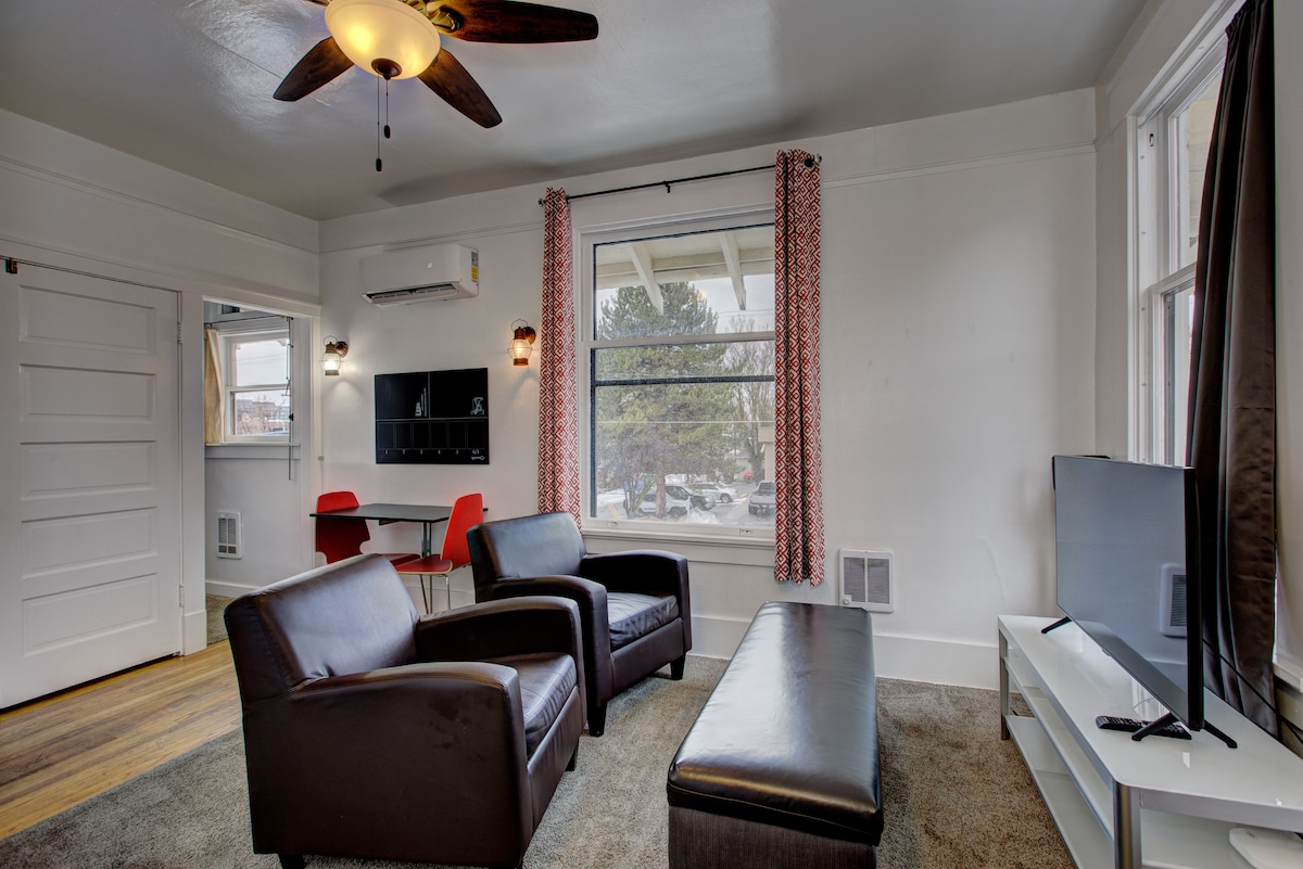 Bungalow artisanal haut de gamme de Hyde Park avec jacuzzi et foyer dans votre propre oasis dans l'arrière-cour. Un bijou magnifique décrit ce Craftsman de plain-pied restauré de 1912, orné de boiseries originales scintillantes et d'éléments intégrés classiques. Cuisine gastronomique avec bar à café et à thé. Détendez-vous dans cette maison à aire ouverte, dans le quartier calme et bordé d'arbres de N End. L'emplacement le plus prisé de Boise, Hyde Park, à 5 minutes du centre-ville. Cette chambre de 2 lits + véranda avec un espace de travail dédié est entièrement meublée avec une décoration moderne et des équipements de base.