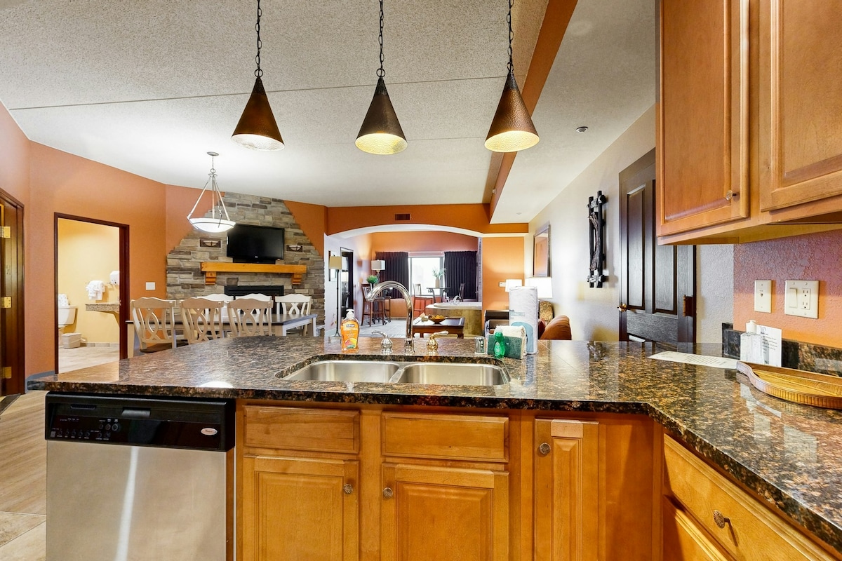 Pas de frais de séjour ! Découvrez tout ce que le Wisconsin Dells a à offrir pendant votre séjour dans cet appartement de luxe, situé à l'intérieur du Chula Vista Resort rempli d'action ! Profitez des restaurants du complexe, du parcours de golf de 18 trous, de la tyrolienne et de bien plus encore! À quelques minutes de toutes les attractions de la région, y compris le mont. Olympus, l'arche de Noé et les sentiers de randonnée! Ensuite, détendez-vous dans notre jacuzzi, confortable jusqu'à nos deux cheminées, profitez de notre salon spacieux ou cuisinez un repas familial dans notre cuisine pleine grandeur !