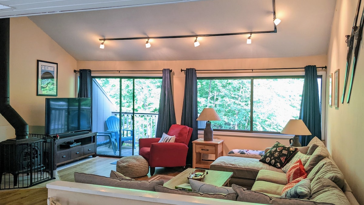 Traversez le ruisseau Mill sur un pont couvert jusqu'à notre confortable maison de ville en duplex avec deux terrasses entièrement meublées. Ski Sugarbush ou Mad River Glen, tous deux à quelques minutes, et raquettes ou ski de fond à l'arrière. Quand il fait plus chaud, profitez d'une vue imprenable depuis notre piscine, jouez au golf sur le magnifique Sugarbush GC conçu par RTJ, faites du vélo de route et/ou de montagne sur les grands réseaux de sentiers locaux et les magnifiques routes de montagne, et partez en randonnée par la porte arrière jusqu'à un étang de castors ou à des segments à proximité du Long Trail.