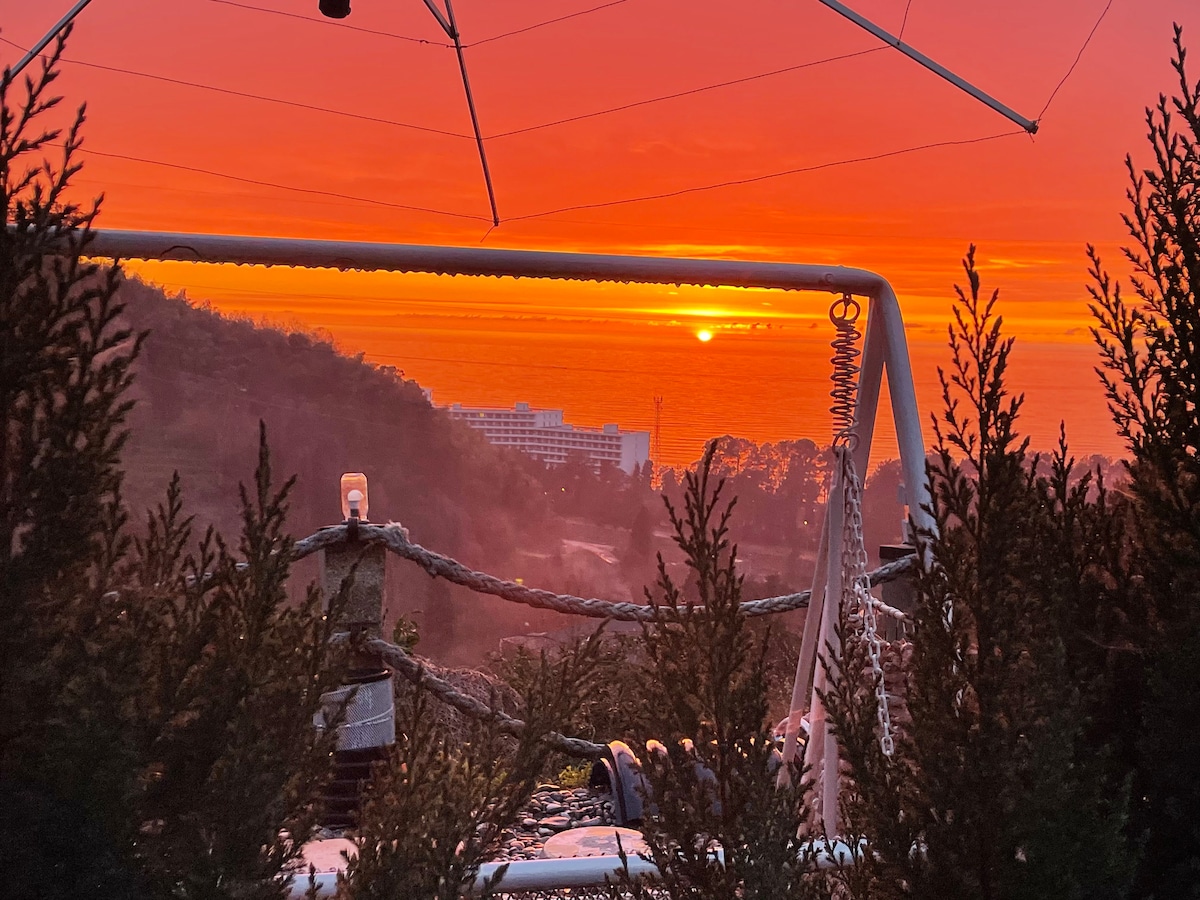 Un chalet unique avec une piscine chauffée et une vue panoramique sur la mer, à seulement 15 minutes du centre de Batumi. Cet endroit est pour ceux qui recherchent l'intimité, le calme et la romance — parfait pour un couple. 🌅 Vous aurez une vue fascinante, une atmosphère chaleureuse et un design élégant. 🏊♂️ Une piscine privée chauffée juste pour vous. 🌿 Le logement est plein de tranquillité et de nature. Important : Pour vous rendre au chalet, vous devez marcher environ 50 mètres en montée. La vue compense largement ce petit effort.
