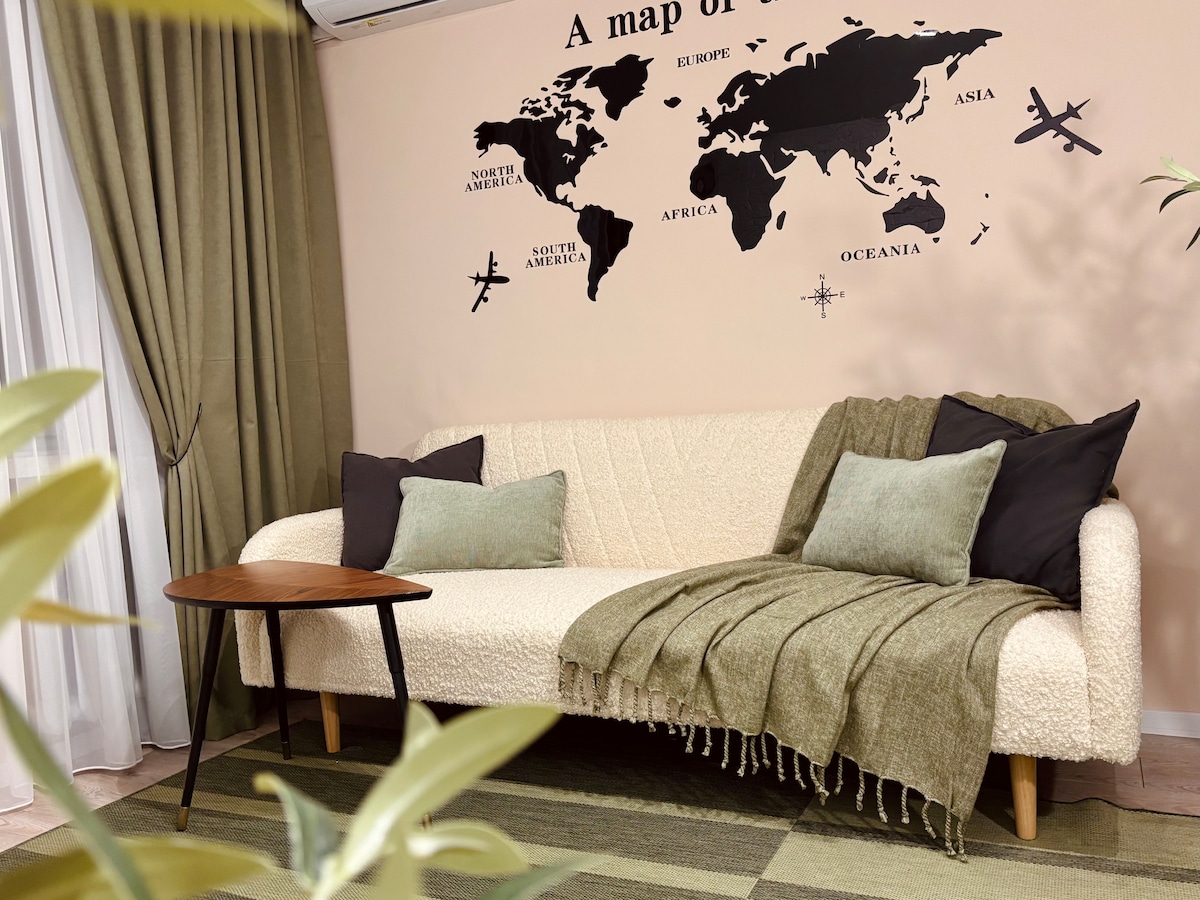 Appartement neuf, confortable et moderne avec un plafond de 3 mètres de haut. Télévision connectée, NETFLIX, système de haut-parleurs, terrasse extérieure, salle à manger avec fenêtres panoramiques. « Cet appartement est conçu pour que vous vous sentiez presque chez vous... mais plus à l'aise. » - Svetlana, hôte