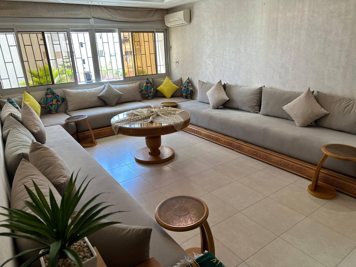 Maison confortable, luxueuse et relaxante à Rabat pour les voyageurs qui apprécient le confort, décorée avec goût et dans le souci du détail dans un quartier calme et sécurisé. Située juste en face de l'océan, à proximité des commerces et restaurants. À seulement 10 minutes à pied de la Kasbbah, de l'ancienne Médina et de la plage de Rabat. Cet appartement est le meilleur choix pour les couples ou amis voyageant à Rabat. Nous avons tout préparé pour que vous vous sentiez comme chez vous pendant votre séjour à Rabat. CLIMATISATION + WI-FI HAUT DÉBIT + NETFLIX