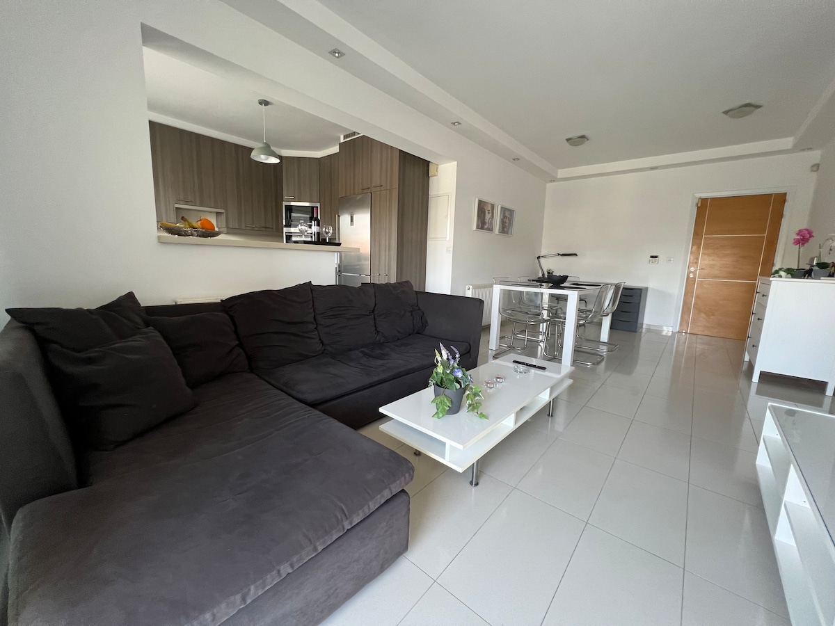 Un moderne 2 lumineux et spacieux Appartement d'une chambre de 95 pieds carrés avec 3 téléviseurs intelligents. Excellent emplacement à proximité de l'Université de Nicosie et de l'hôtel Hilton Park. À 5 minutes en voiture du centre de Nicosie et à distance de marche du centre commercial et du Centre national d'exposition de Chypre et des restaurants, cafétérias, boulangeries juste à l'extérieur du bâtiment. Télévision intelligente NETFLIX GRATUIT et collations fournies, boissons, machine à expresso avec ses cafés et machine à pop-corn.