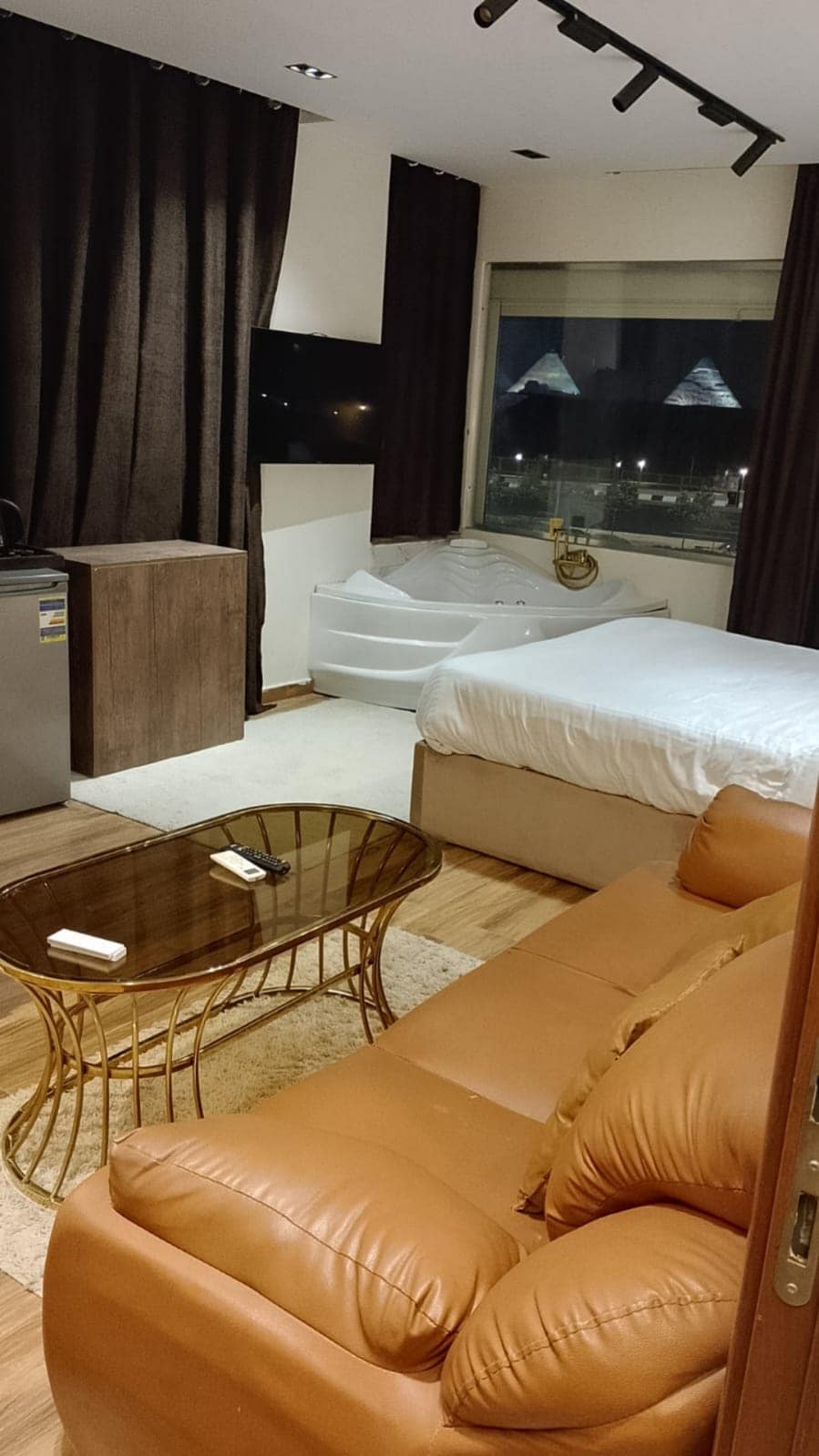 chambre double de luxe avec vue sur les pyramides depuis le lit . salle de bain privée, baignoire, sèche-cheveux, eau chaude, miroir, shampoing, bonnet de douche, papier toilette,serviettes. toit-terrasse avec vue charmante sur les pyramides, petit déjeuner sur le toit Accueil 24h/24, ascenseur . climatisation ,télévision, minibar, télé , coffre-fort, bouilloire, fenêtre insonorisée, lits confortables, meubles modernes. à dix minutes à pied des pyramides de Gizeh, à proximité des restaurants et boutiques , des distributeurs automatiques de billets, un accès facile à n'importe quelle partie de Gizeh et du Caire.