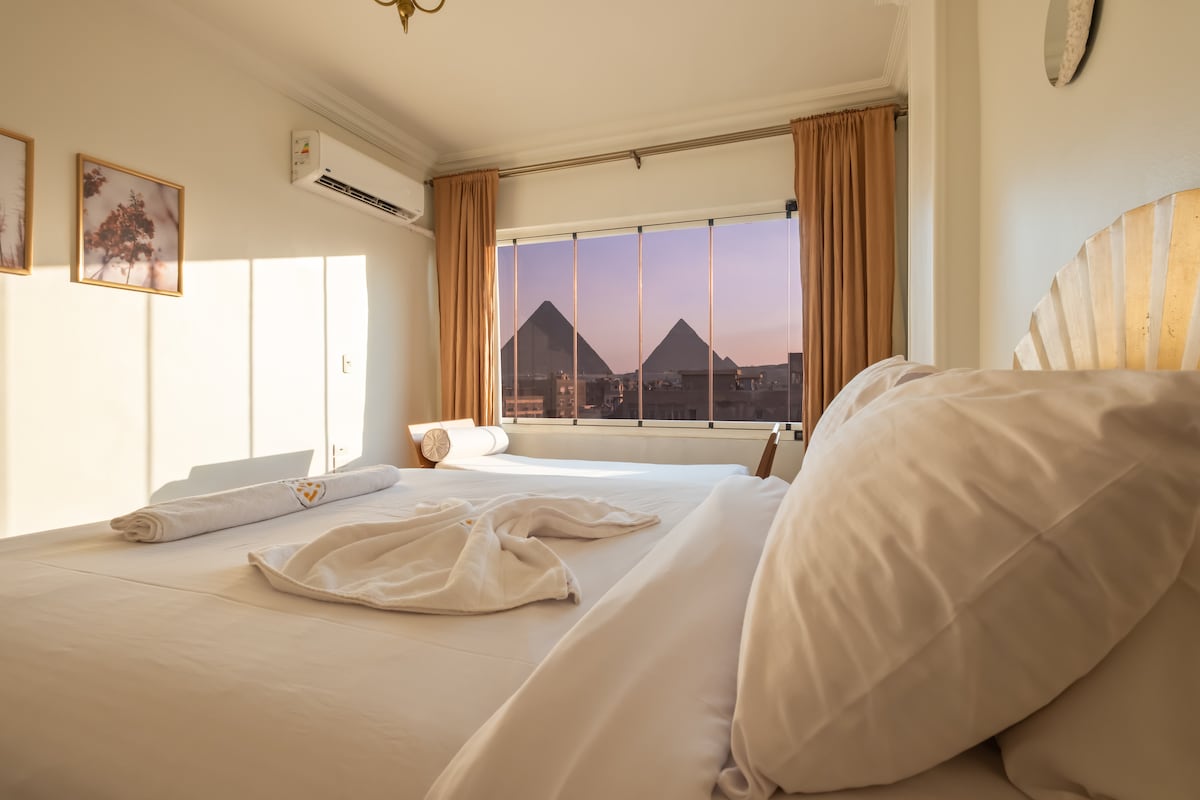 Appartement sur le toit avec vue complète sur les pyramides et le sphinx. Grande terrasse privée avec canapé et table et un endroit traditionnel spécial pour séjourner, se reposer et profiter de la vue magnifique. Porte d'entrée sécurisée. Cuisine entièrement équipée. Salon avec Smart TV. 1 toilette seule et 1 grande salle de bain, avec douche et 2 mains lavables. 2 chambres, 1 grande avec lit King Size, climatisation et télévision connectée et 1 avec lit double. L'appartement est tout neuf. Venez profiter d'un séjour exceptionnel chez nous. Nostalgie assurée !☀️☘️