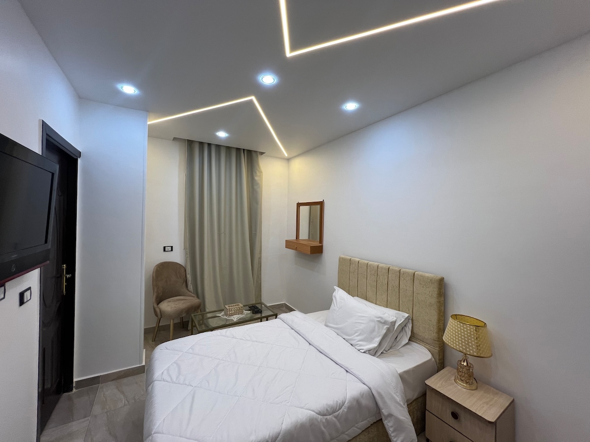 Profitez d'un séjour dans une chambre simple LA CHAMBRE EST ÉQUIPÉE 1 lit Queen Size, climatisation, chauffage, télévision par satellite, minibar et équipements de base comme un bureau, un miroir, une armoire, un coffre-fort et des cintres. LES CARACTÉRISTIQUES DE LA SALLE D'EAU serviettes, shampoing, gel douche, savon pour les mains et sèche-cheveux. COMMENCEZ VOTRE JOURNÉE TOUS LES JOURS ménage, eau en bouteille, thé, Nescafé et sucre. PROFITEZ GRATUITEMENT accès à notre Panorama Pyramids View Rooftop Restaurant à tout moment. Mon personnel est disponible 24h/24 pour répondre à vos besoins.