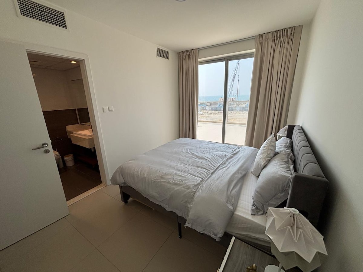 Take a break and unwind at this peaceful space while taking in the beautiful waters from the balcony. Studio close to free Beach, Golf course, Marina and luxury hotels: Ritz Carlton, Waldorf. 20min drive to the Hajar Mountains, 5min to Alhamra. Lockbox access. Parking, Pool, play area. Full sea view from balcony. Sleep: King size bed+Kitchen: cooker, w/machine, Fridge, Dolce Gusto, toaster. Other: Wifi, Smart TV, 24/7 market/cafe. Walking distance to restaurants, Sailing and Yacht Club.