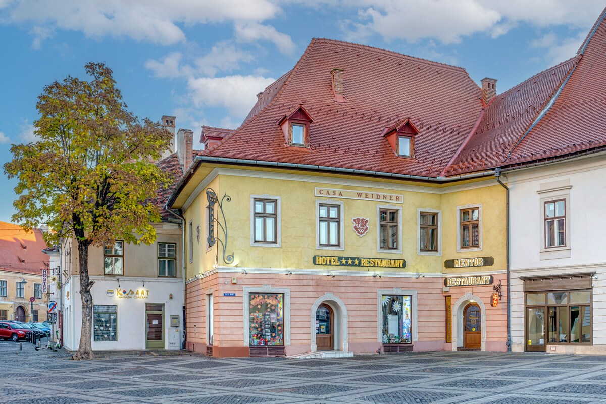 Book a Single room at Casa Weidner, located right in Sibiu’s Big Square, in the heart of the historic center, in a heritage building dating back to 1584. Blending modern comfort with original architectural details, some rooms feature authentic wooden beams or decorative arches. Equipped with AC, private bathroom, WiFi, TV, coffee machine and kettle, steps from main attractions and near parking. Sibiu Airport is 7 km away, and the railway station is 800 m.