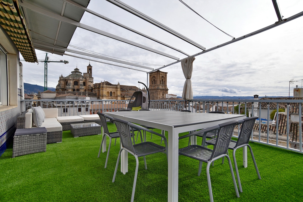 Penthouse de 120 m2 récemment rénové en 2024 en face de la cathédrale. Deux chambres (une quadruple et une double), une salle de bain et un WC, toutes extérieures et avec une vue imprenable sur Grenade. Grand salon-salle à manger et cuisine. Toutes les installations sont conçues et équipées selon des normes élevées de confort, de qualité et de service (éclairage progressif, stores/volets mécanisés, télécommande, fenêtres à triple vitrage, douche à l'italienne avec effet pluie et cascade).