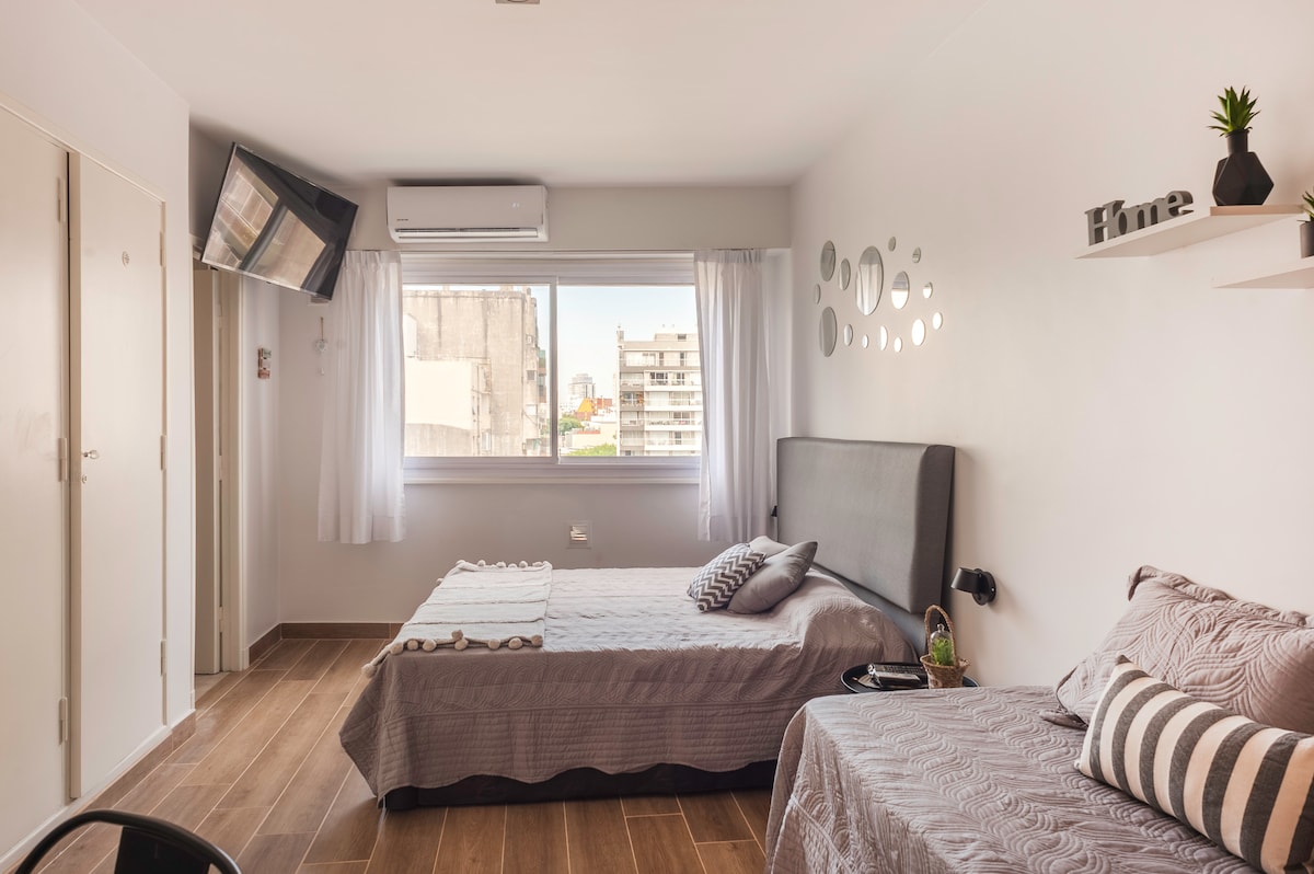 NOUVEAU MATELAS ! ! LIT QUEEN SIZE ! Soyez accueilli par le soleil de l'après-midi inondant ce studio spacieux et entièrement équipé dans le quartier traditionnel d'Almagro. À quelques mètres de l'hôpital italien, près du mythique parc du Centenaire et avec des connexions avec toute la ville. - Grand balcon avec une vue dégagée, idéal pour se détendre avant ou après une longue journée en ville. Internet Wi-Fi 100 Mo Smart TV LED 40-Flow, youtube, chromecast, etc.