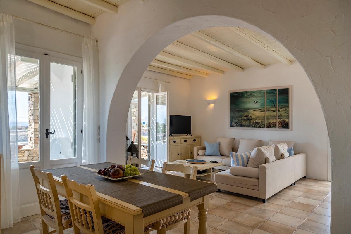 La résidence de luxe Vastblue est un appartement indépendant (85 m²) à 70 mètres de la mer et à 5 minutes à pied de la célèbre plage de sable d'Ampelas. Elle dispose d'une piscine privée, de deux vérandas spacieuses avec une vue magnifique sur la mer et l'île voisine de Naxos. Il y a deux chambres, deux salles de bains, une grande cuisine entièrement équipée avec une table à manger et un salon. Elle est très propre et confortable et combine l'architecture traditionnelle des Cyclades avec un design moderne.