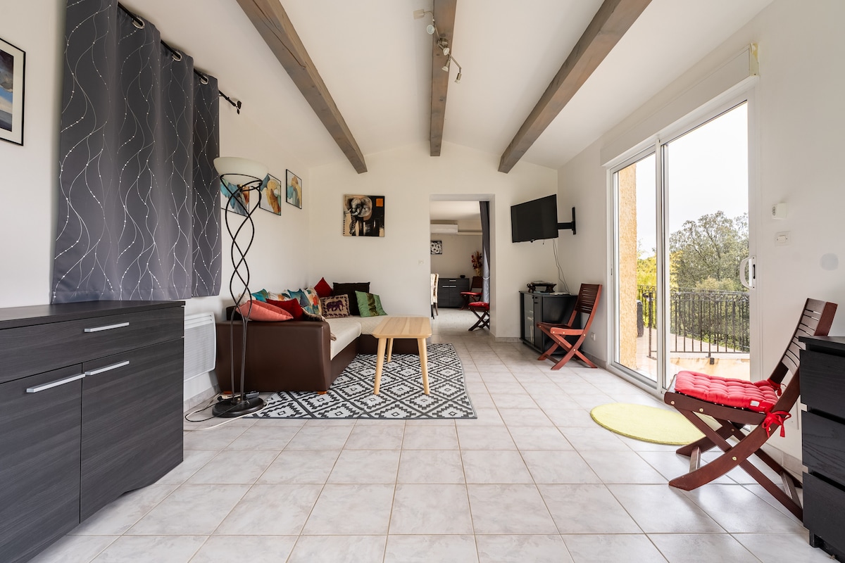 Beau studio meublé 21m² avec salle d'eau-WC, en rez de jardin d'une villa, avec terrasse privée 16m², dans village pittoresque du centre Var, à 30 km du bord de mer et des Gorges du Verdon. Cuisine intégrée et très bien équipée, lit 2 personnes 140x190, canapé 2 places convertible en méridienne ou en lit 1 place pour enfant. TV TNT SAT. Climatisation. Lave-linge et Lave-vaisselle, multiples équipements et produits fournis. Non fumeur / Pas d'animaux. Classement 2 étoiles aux Gîtes de France.