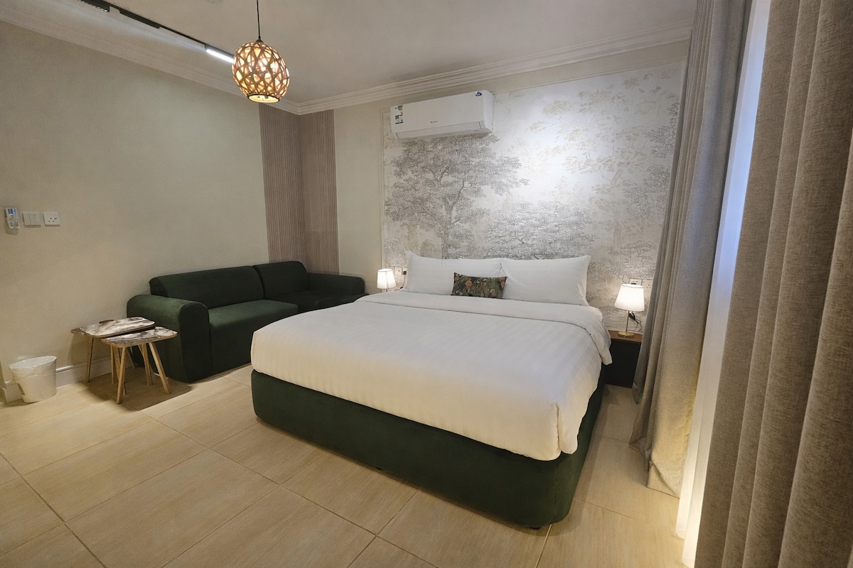 Élégant appartement d'hôtel dans le quartier d'Al-Nuzha – Dammam, avec des meubles luxueux de « Abyat » et un design moderne. Il se compose d'une chambre, d'un salon avec un canapé, d'une cuisine complète et d'une salle de bain propre. Comprend : arrivée autonome, stationnement privé, Internet haut débit, télévision connectée et climatisation centrale L'emplacement est spécial et proche de la corniche, des centres commerciaux et des restaurants. Convient aux familles et aux voyageurs. Peut accueillir jusqu'à 4 personnes.