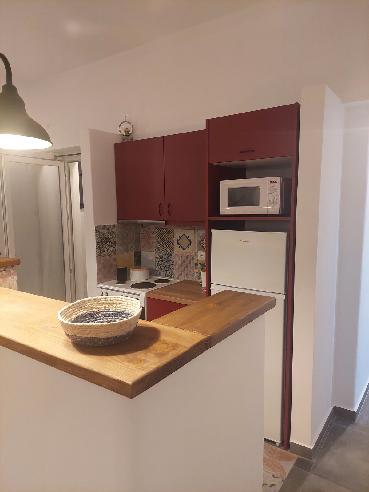 Il s'agit d'une maisonnette récemment construite de 60 m². Au rez-de-chaussée, il y a une cuisine, un salon et une salle à manger et au 1er étage, il y a la chambre et la salle de bain. Elle offre une vue imprenable sur la plage d'Agios Petros et de ses deux terrasses (chambre et salon). Elle est à seulement 3 km du port et à 500 m de la route provinciale. La plage d'Agios Petros est située à 500 m de la maison et dans la région il y a des tavernes et une boulangerie.