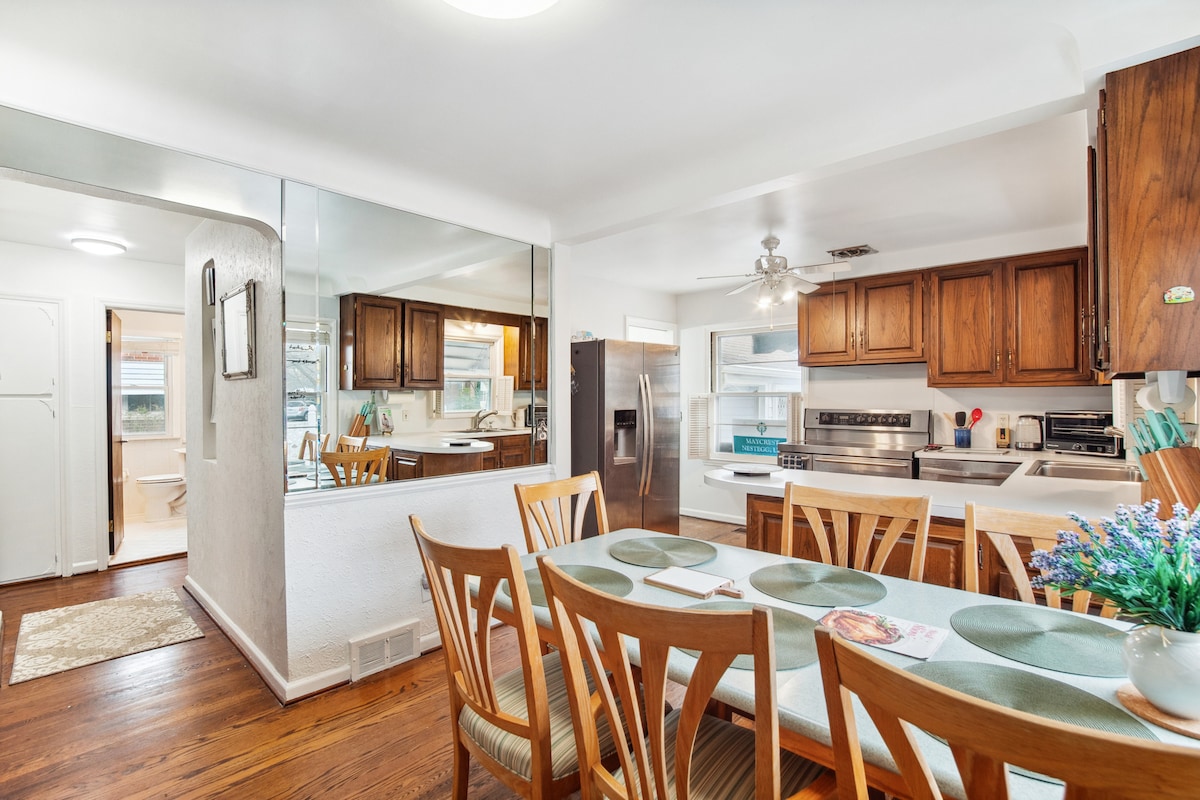 Ranch du milieu du siècle à 4 chambres juste en face de Royal Oak. La véranda vitrée est la pièce maîtresse : une télévision de 70 pouces, un foyer électrique, des jeux de société, une table de jeu à écran tactile et une table à manger pour 8 convives, le tout derrière des baies vitrées du sol au plafond donnant sur la cour arrière. Sortez dans la cour privée clôturée pour profiter du barbecue au charbon de bois, du hamac et des sièges extérieurs, ou restez à l'intérieur près du foyer du salon. Cuisine entièrement équipée, suite au sous-sol avec douche à effet de pluie, borne de recharge pour VE au 2e étage et stationnement gratuit et illimité dans la rue.