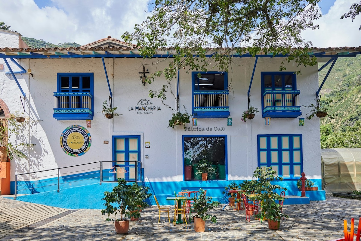 FINCA LA MANCHURIA une ferme productrice de café cachée à découvrir au cœur des montagnes d'Antioquia, réservée à ceux qui veulent vivre une expérience authentique. Connectez-vous à chaque phase de production , laissez-vous imprégner par la magie du café. Profitez de tout le confort de notre maison centenaire, avec des vues panoramiques sur la campagne, offrant un environnement propice à un repos réparateur. Nous disposons de 9 chambres avec différents hébergements de 2 à 4 personnes.