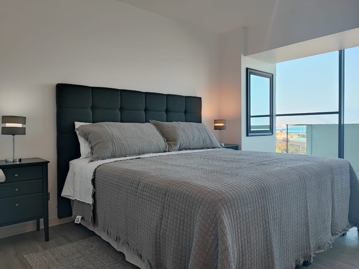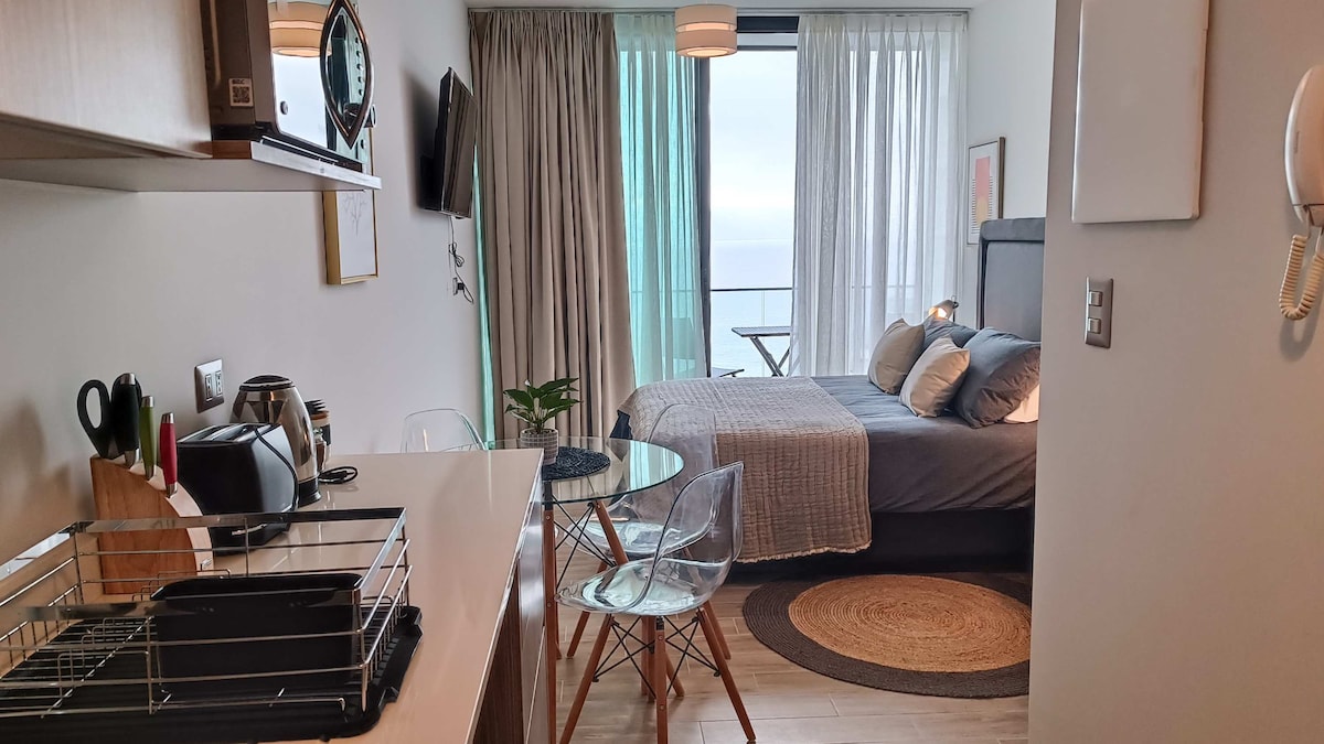 Profitez de la vue sur la mer depuis cet appartement spectaculaire d'une chambre au cœur d'Antofagasta, à côté du centre commercial d'Antofagasta et du front de mer. Conçu pour les voyageurs d'affaires et les couples, entièrement équipé avec une décoration moderne et élégante. Il dispose de draps et de serviettes, d'Internet, d'un réfrigérateur, d'une télévision intelligente, d'ustensiles de cuisine et d'une terrasse entièrement équipée avec la meilleure vue sur la mer de Puerto Nuevo. Réservez maintenant et vivez l'expérience !