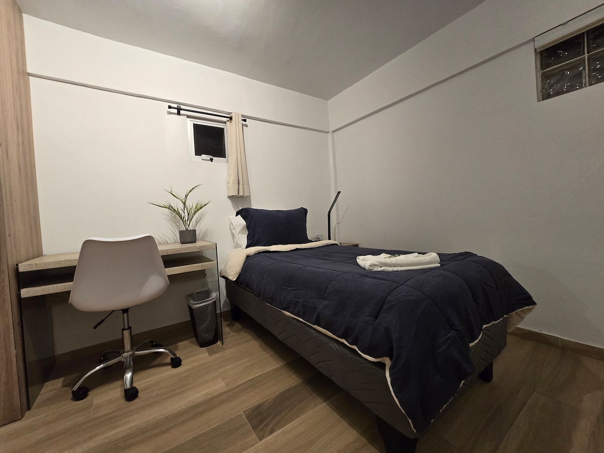 Amplia y cómoda habitación, baño privado, ubicada en un cuarto nivel con vista interior. Cuenta con closet, velador, escritorio y smart TV 43”. Ropa de cama de algodón, gel de ducha, shampoo y acondicionador. Servicio de limpieza y cambio de sábanas 1 vez a la semana.