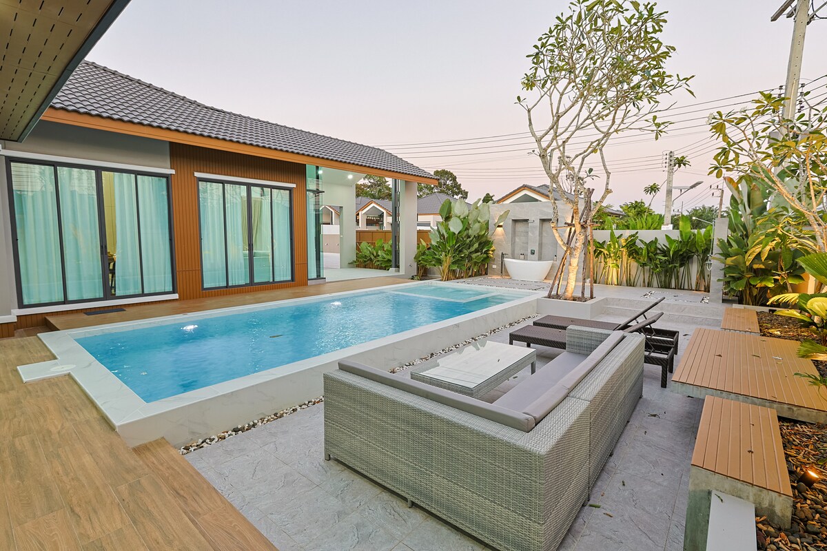 Villa moderne de style méditerranéen avec piscine privée ✨Détendez-vous avec style dans cette villa lumineuse de 3 chambres et 3 salles de bain d'inspiration méditerranéenne au cœur d'Ao Nang, Krabi. Parfaite pour les familles, les groupes d'amis ou les longs week-ends à la plage, la villa allie des espaces intérieurs chaleureux à une piscine privée étincelante éclairée en bleu encadrée par d'élégantes arches. ✦ Piscine privée de 3,8 × 10 m avec bassin pour enfants ✦ Terrasse extérieure et barbecue – idéal pour les repas au coucher du soleil ✦ stationnement gratuit ✦ Cuisine entièrement équipée