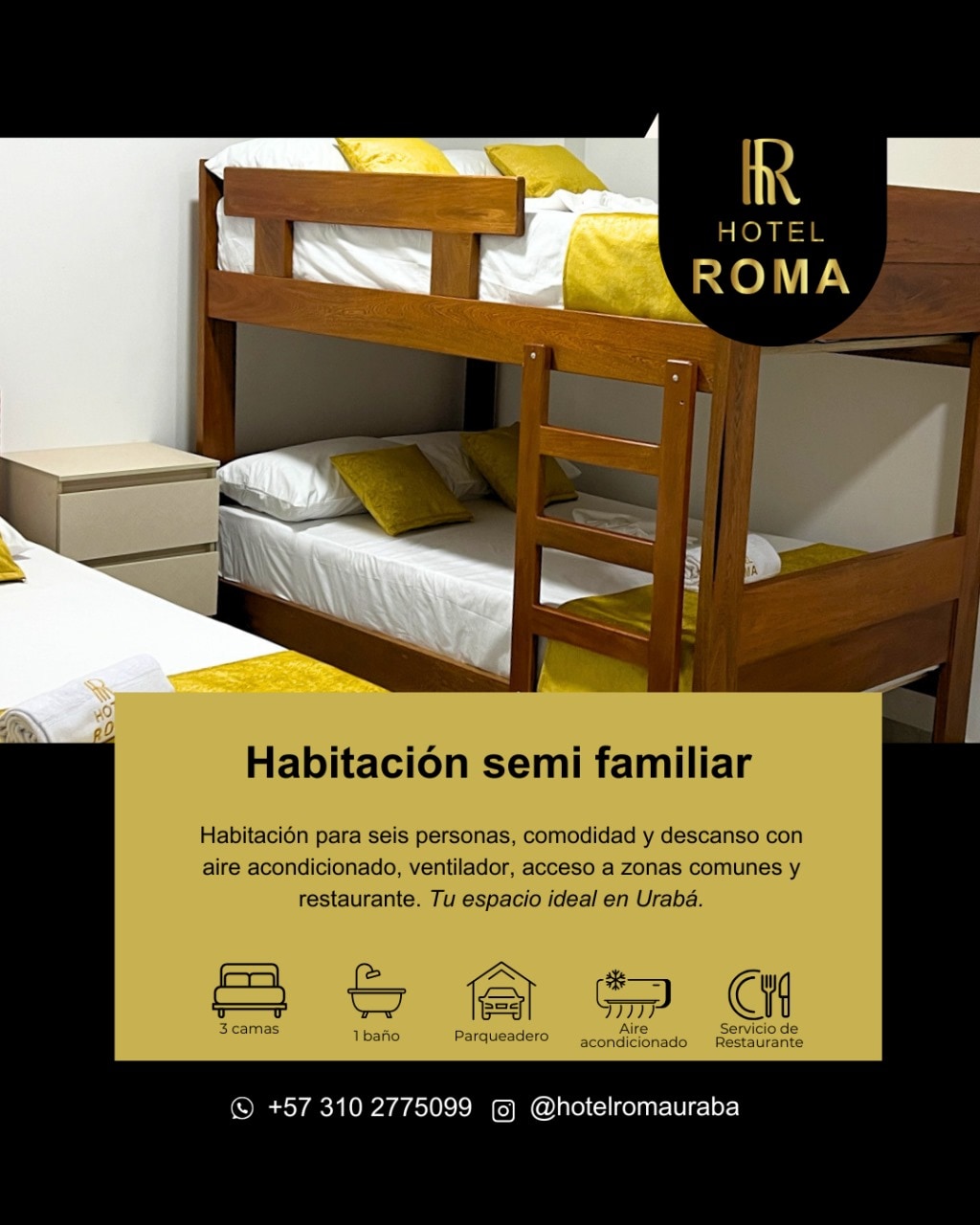 El Hotel Roma es mucho más que un lugar para dormir, y queremos ser la primera opción de alojamiento en Urabá, ofreciendo un espacio que une comodidad, hospitalidad y el ambiente perfecto para quienes llegan por negocios, placer o ambos.