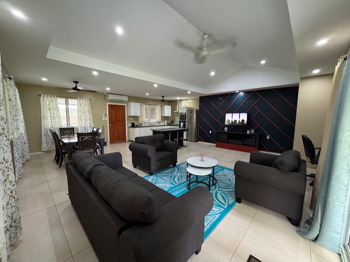 Découvrez le meilleur de l'île dans cette villa moderne et sécurisée, parfaitement située entre Apia et Vaitele. Alliant confort, style et commodité, c'est le point de départ idéal pour les familles/amis/professionnels. - 3 chambres, 3,5 salles de bain - Plan ouvert avec sols en béton poli - Cuisine entièrement équipée avec lave-vaisselle. - Ventilateurs de climatisation et de plafond - Wifi Starlink gratuit et télévision connectée - Eau potable purifiée - Laveuse et sécheuse - Piscine et porche couvert - Abri pour 2 voitures avec portail électrique - Générateur de secours et réservoir d'eau