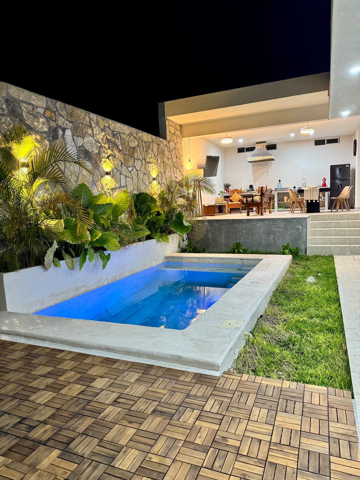 Amusez-vous avec toute la famille dans ce logement de luxe avec tout le confort et zone sécurisée au cœur de la belle Huasteca Potosina , passez des vacances inoubliables, portail électrique pour un véhicule, jardins, piscine éclairée, pergola éclairée, bohío, grill à viande, chambre complète pour une capacité maximale de 4 personnes, kitchenette équipée , dressing et 2 salles de bains complètes une à l'étage dans la chambre et une autre piscine . Événements ne sont pas acceptés Animaux non. ni invités