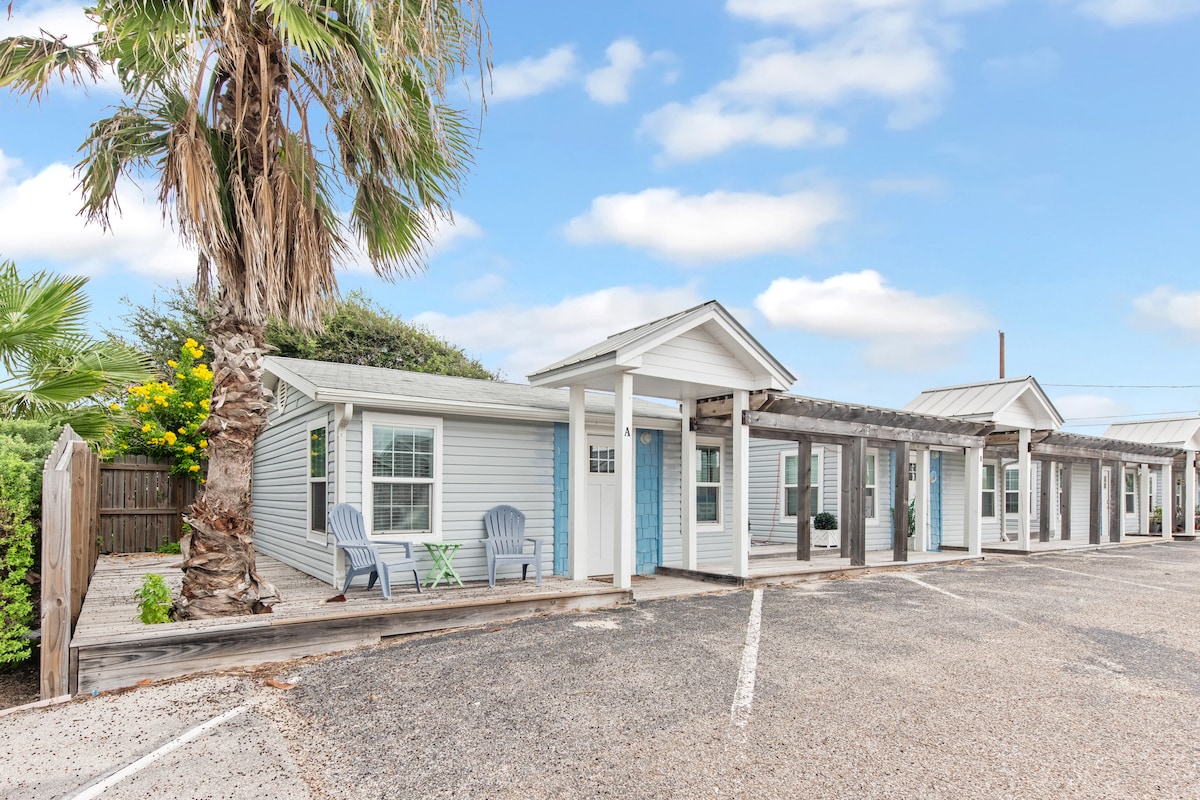 Bienvenue au chalet Coral. Cet adorable chalet indépendant d’une chambre et d’une salle de bain dégage une atmosphère de micro-maison et est parfait pour une escapade à la plage, une fin de semaine de pêche ou une escapade romantique. À l’origine, cette maison se trouvait dans le Vieux-Port d’Aransas, mais elle a été déplacée à son emplacement actuel et entièrement rénovée, notamment avec des murs à panneaux à feuillure et des accents en bois de récupération.