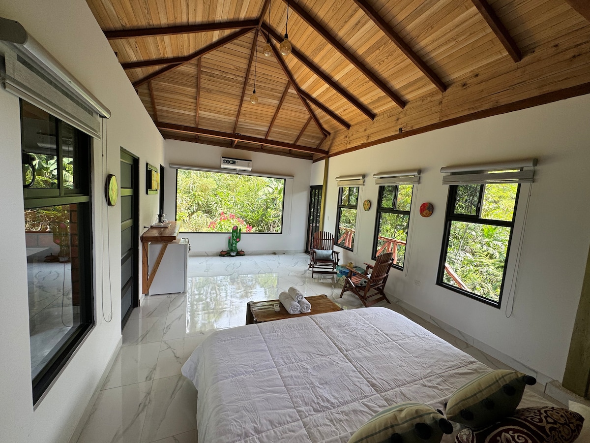 Détendez-vous dans cette escapade unique et calme, avec cette personne spéciale cette chambre est conçue exclusivement pour que vous ayez une pause confortable et que vous sortiez un moment de la routine. Il dispose de : Lit 2 places et demi Jaccuzi avec mousse apaisante Smart TV avec netflix Mini Bar ( coût en plus de la valeur de l'hébergement) Balançoire style nid Vous pourrez utiliser notre piscine chauffée couverte de 8 h 00 à 23 h 00