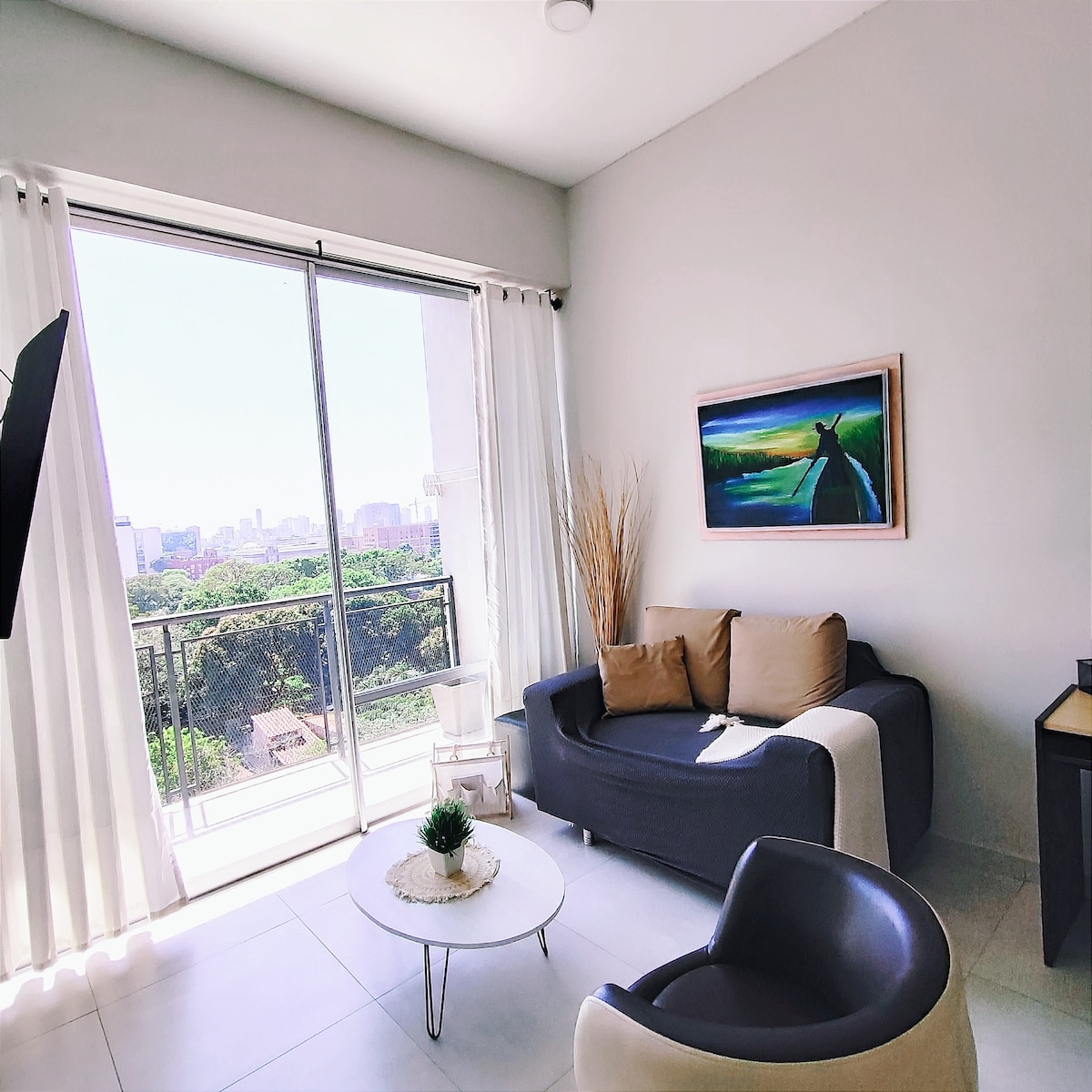 Departamento nuevo a estrenar en edificio lujoso. Tiene 40m² propios, con Smart TV, WIFI, y en el edificio tenes todos los amenities: Piscina , Quincho climatizado con parrilla, Sala de juego de niños, gimnasio equipado, etc Queda a 5 minutos en auto del centro corporativo mas valorado de la capital, y a 25 minutos caminando. Tambien queda a 11 minutos en auto al aeropuerto Silvio Pettirossi Tiene una cama matrimonial + un sofa cama. En total se pueden hasta 3 personas para dormir.