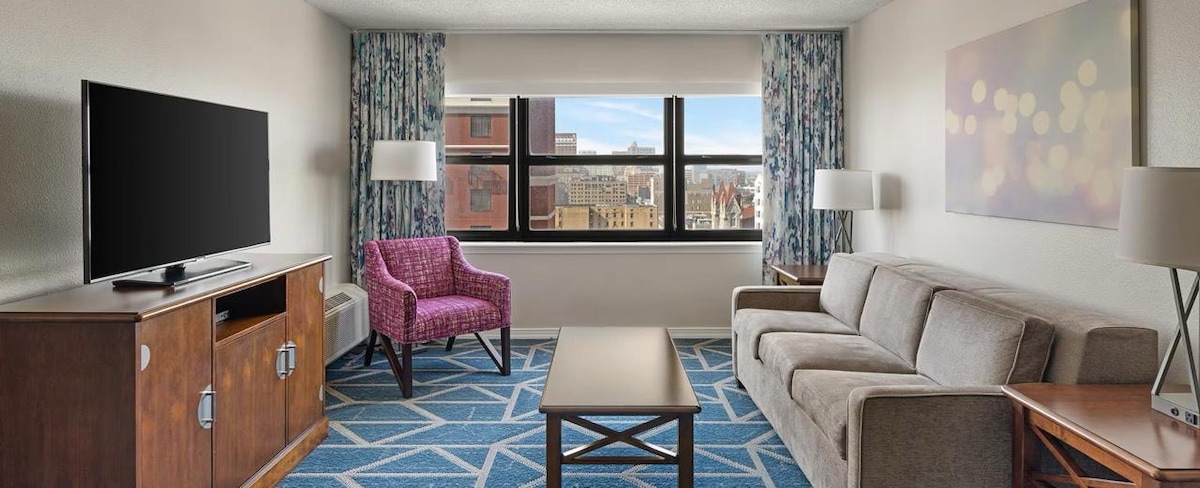 Stay steps from the Atlantic City Boardwalk at Wyndham Skyline Tower. This 1-bedroom suite features a king bed, queen sleeper sofa, full kitchen, and spacious living and dining areas. Enjoy resort amenities including an indoor pool, hot tub, fitness center, and game room. Perfect for beach lovers, foodies, and casino-goers, this location offers comfort, convenience, and endless entertainment right outside your door.