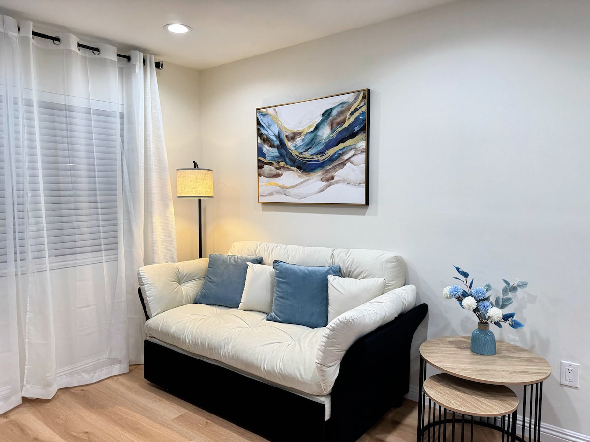 Retraite spacieuse d'une chambre à El Monte avec confort moderne et intimité. Comprend une chambre complète avec un grand lit, un salon confortable, une télévision, une connexion Wi-Fi rapide et une cuisine entièrement équipée pour des repas maison. Entrée privée et parking gratuit inclus. Situé dans un quartier calme avec un accès facile à LA, Pasadena et Arcadia, à seulement 25 minutes. Parfait pour les couples, les petites familles ou les voyageurs d'affaires à la recherche de confort, de commodité et d'un séjour paisible dans le sud de la Californie.