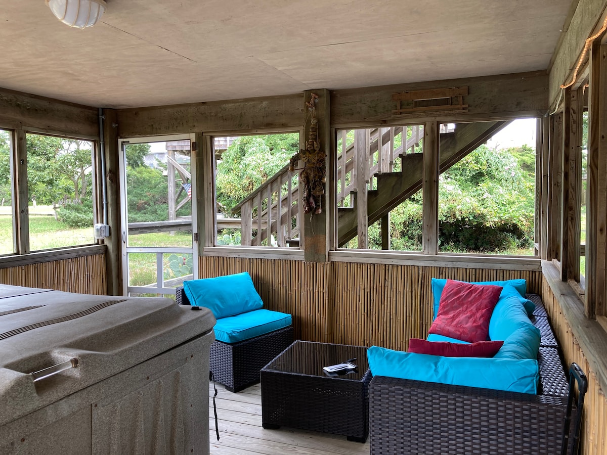 Venez profiter du vieux village d'Avon dans une rue calme à sens unique. La suite Surfstead offre un mélange éclectique d'histoire de l'île, d'artisanat et de confort dans l'une des plus anciennes maisons de l'île d'Hatteras. Il y a une terrasse privée et une entrée menant à un salon et un coin repas équipés d'une télévision Roku. Préparez vos repas dans la kitchenette entièrement approvisionnée. La chambre dispose d'un lit Queen Size avec une autre télévision Roku et d'une salle de bain complète avec une douche carrelée personnalisée. Un jacuzzi privé aussi !