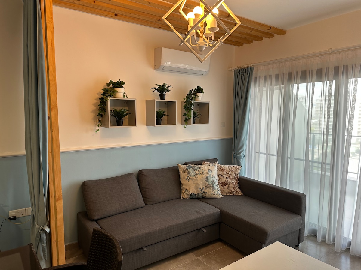 Appartement 1+1 à Royal Sun. Peut accueillir jusqu'à 5 personnes. Tout ce dont vous avez besoin est à distance de marche dans le complexe. Vous avez 2 piscines, une salle de sport, un terrain de football/basketball et un court de tennis. À l'extérieur du complexe, vous avez un supermarché, une boulangerie, des bouchers, une pharmacie, un café, un restaurant, un bar et bien d'autres. Vous êtes entouré de 3 casinos MERIT, THE ARKIN et GRAND SAPPHIRE CASINO qui sont à distance de marche de l'appartement. Le SKYLINE BAR AND LOUNGE est également à proximité. La plage de Longbeach est accessible à pied