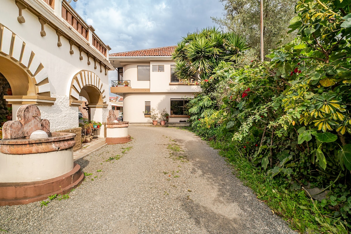 Emplacement calme, 4 chambres et 3 1/2 salles de bain - de nouvelles finitions et meubles sont situés à 10 min du centre historique de la ville de Cuenca (Parque Calderon) ; Grands espaces, meubles, finitions rustiques et modernes, front/côtés et grande cour arrière. Parking/alarme/caméras de sécurité/Internet et télévision par câble, table de billard, foyer et barbecue/grill extérieur inclus - entouré de plantes et de fleurs pour se détendre et profiter de la nature étant très proche de la ville !