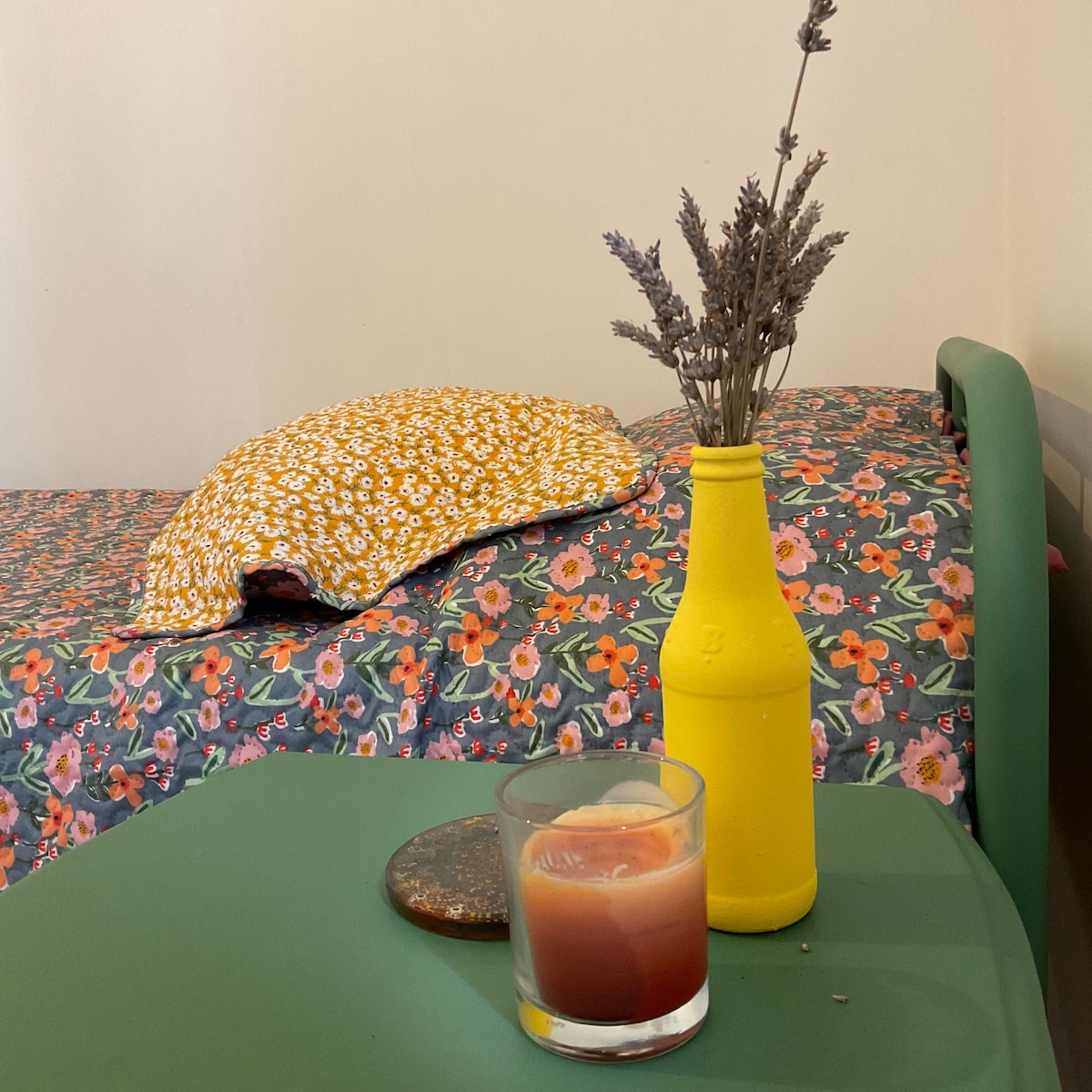 c'est la 2ème chambre à louer dans mon appartement, il contient un lit simple avec placard, et des artefacts pour le rendre chaleureux et agréable, la coordination des couleurs le rend agréable.