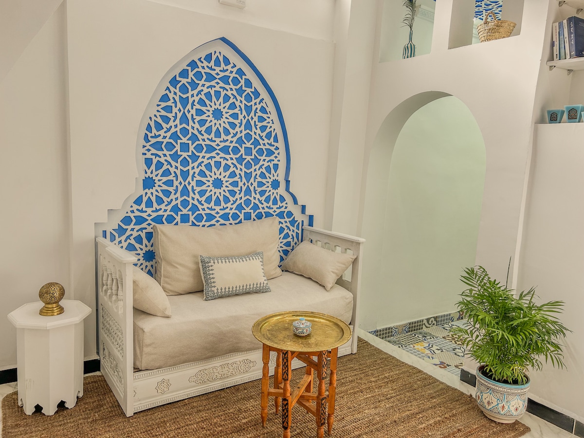 Profitez d'une expérience magique dans notre maison récemment rénovée, située au centre de la ville bleue. L'architecture arabo-andalouse authentique rencontre le confort moderne. De nombreuses attractions touristiques sont facilement accessibles à pied : boutiques d'artisanat, souk, kasbah, cafés, restaurants et banques à proximité. La place Outa el Hammam, la cascade Ras El Maa et la mosquée espagnole sont également facilement accessibles. Idéal pour les familles, les amis et les groupes.