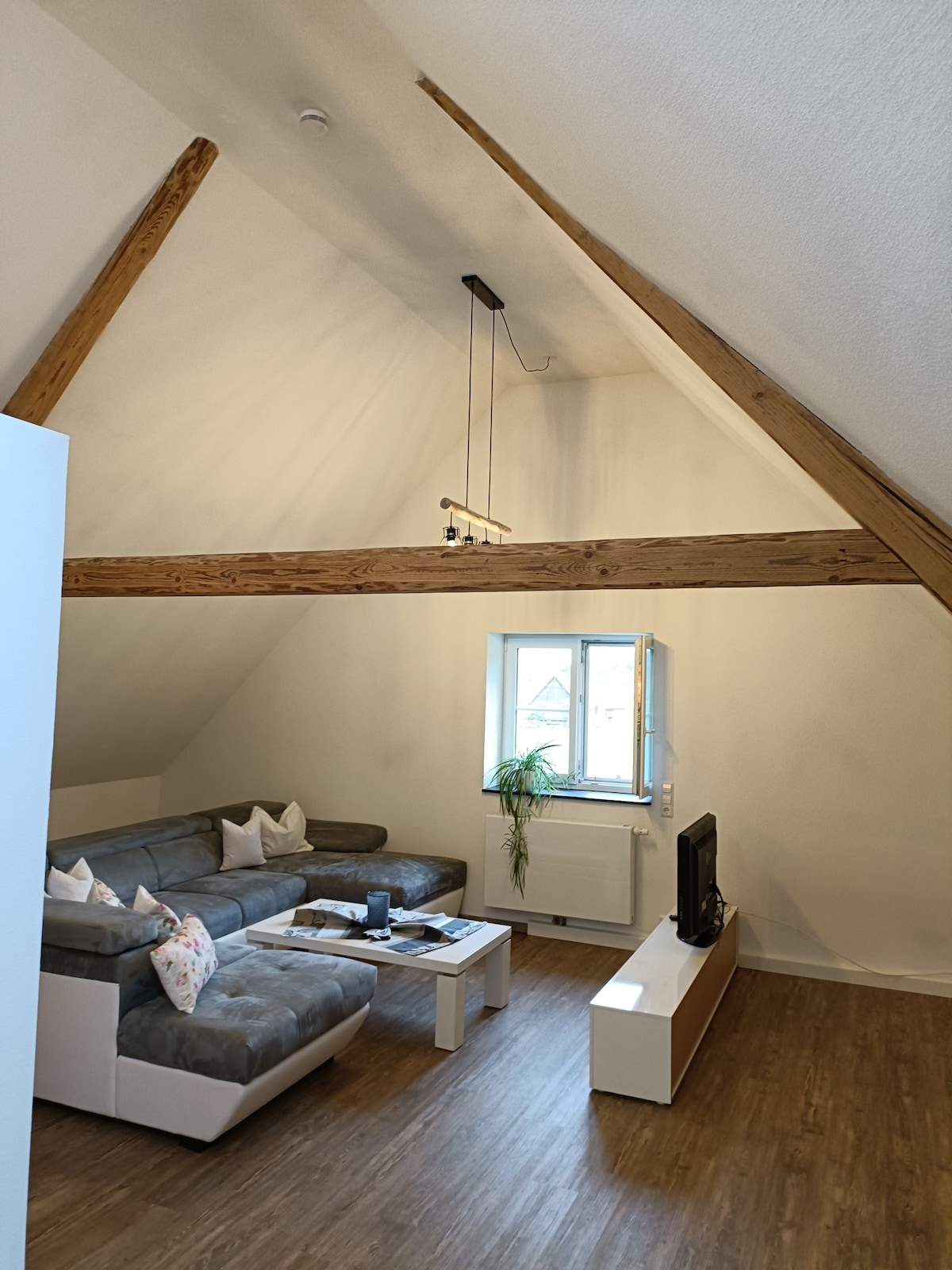 Sie wohnen gemütlich und authentisch auf 24qm in unserem "Bauernstüble". Im Wohnraum befindet sich eine Essecke, ein Kleiderschrank, Sofa und Satelliten-TV. Über eine Treppenleiter gelangen Sie in den Schlafbereich mit einer 140x200cm Matratze. Angrenzend zum Eingangsbereich befindet sich eine kleine aber vollwertig ausgestattete Küche. Ein modernes Badezimmer mit Fußbodenheizung und Tageslicht rundet die Wohnung ab. Eine Waschmaschine + Trockner kann für 4€ pro Waschladung mitbenutzt werden.