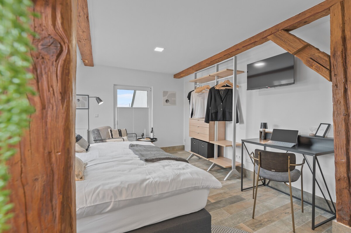 RICLS – Vivre moderne à Wurmberg (chambre double L) Bienvenue au RICLS! Profitez de chambres modernes et entièrement équipées dans un endroit calme. Chaque chambre dispose d'une cuisinette privée, d'une télévision intelligente et d'une connexion Wi-Fi gratuite. Les commodités peuvent varier en fonction de la taille de la chambre réservée. Une grande cuisine commune pour cuisiner et faire de la pâtisserie, ainsi qu'une buanderie commune avec des laveuses à monnaie et une sécheuse gratuite, sont disponibles. Un stationnement gratuit est disponible juste en face de l'immeuble.