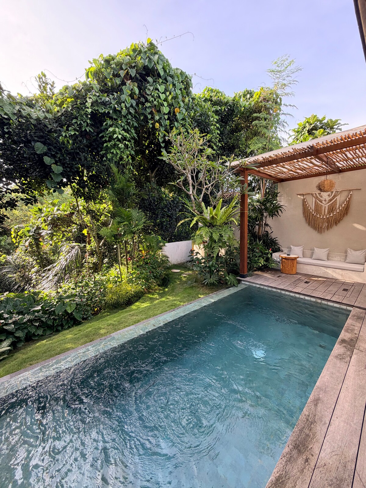 Réveillez-vous dans votre propre villa méditerranéenne, parfaite pour les couples ou les voyageurs en solo à la recherche d'une escapade élégante à Bali. La suite principale spacieuse comprend un lit « king size » et une salle de bain attenante. Le salon lumineux, la salle à manger confortable et la cuisine entièrement équipée vous permettent de vous sentir comme chez vous. Sortez et profitez de votre piscine privée et de votre salon de jardin luxuriant, avec un sofa et de la verdure tropicale. Votre propre havre de paix.