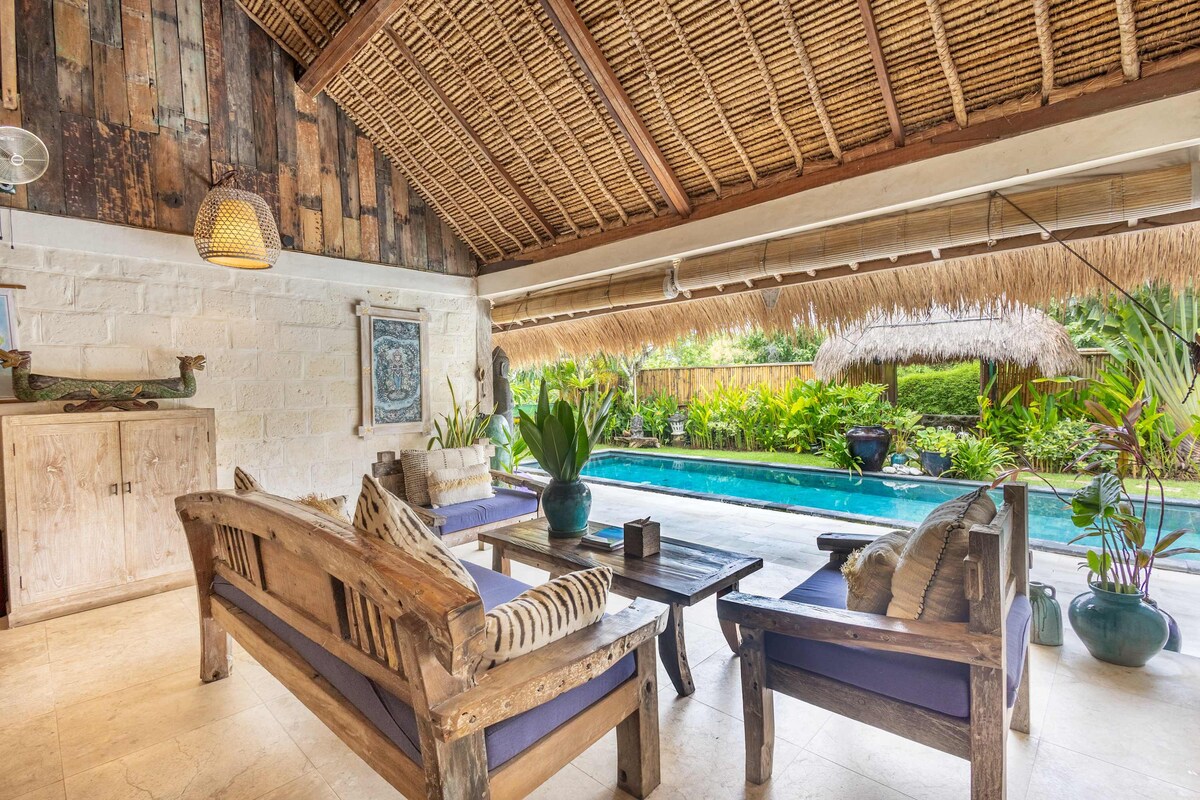 Villa privée de designer à Bingin avec piscine — parfaite pour les couples et les séjours spéciaux. Un espace chaleureux et magnifiquement conçu qui vous donne l'impression d'être chez vous tout en vous offrant une expérience balinaise unique. L'espace de vie ouvert donne sur votre jardin privé et votre piscine – parfait pour les longues matinées, les trempettes au coucher du soleil et les soirées détendues. Idéal pour des escapades romantiques en toute intimité. Entretien professionnel avec une grande attention aux détails. Lit très grand (king size), Wi-Fi, téléviseur intelligent et stationnement inclus. À proximité de la plage de Bingin, des meilleurs cafés et restaurants