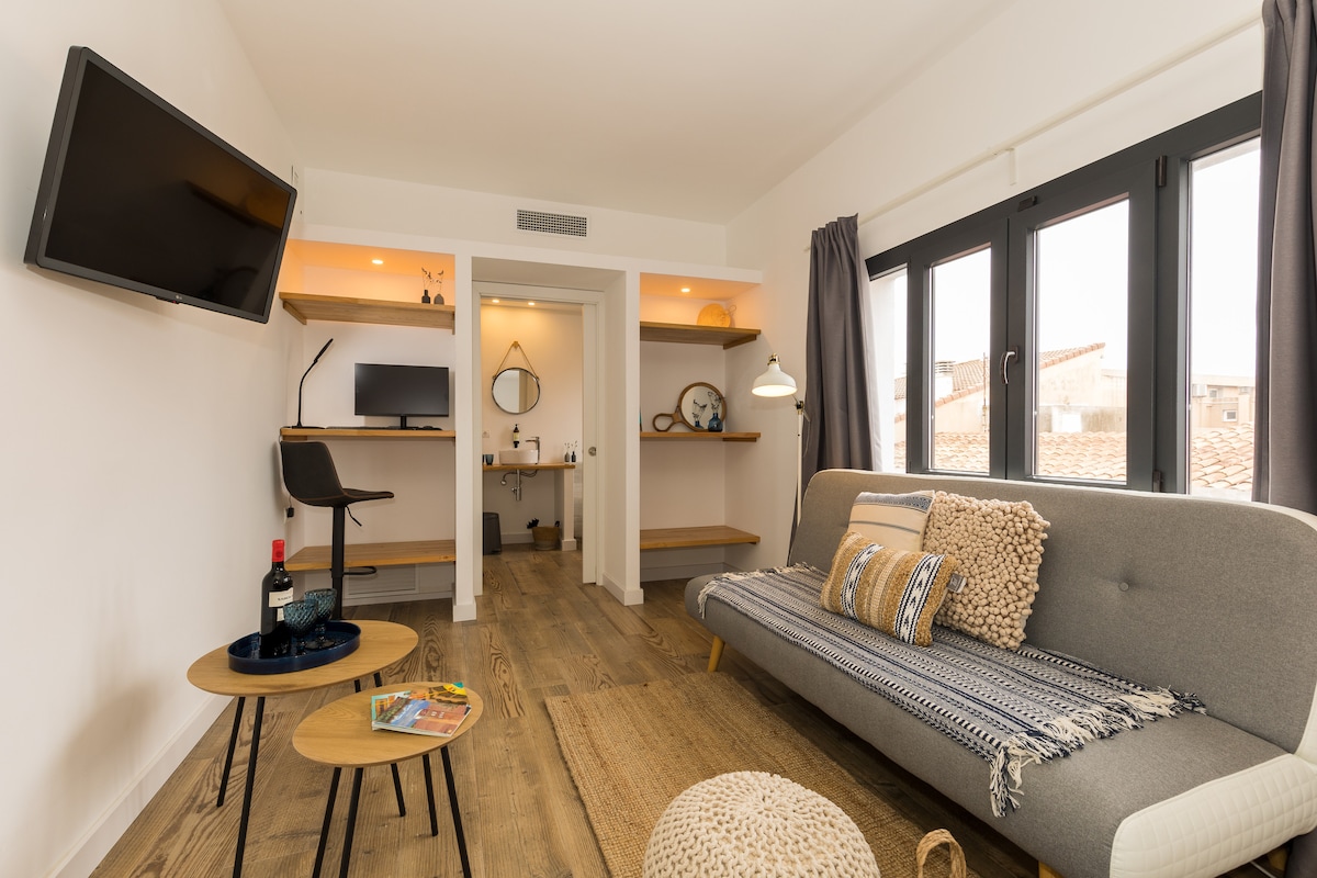 Disfrute de la comodidad y el estilo en nuestra habitación equipada con una cama matrimonial, armario amplio y terraza grande. El espacio está diseñado para maximizar su relajación, incluyendo un ventilador para mantener el ambiente fresco y un baño compartido cuidadosamente mantenido. Perfecta para escapadas tranquilas. No dispone de baño privado, el baño se comparte con otros huéspedes.