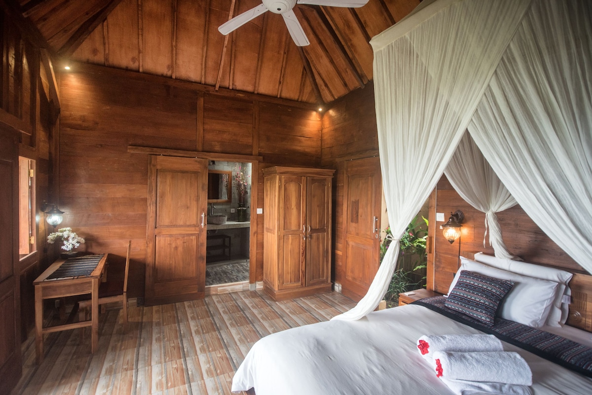 Welcome to KUDUS Bali, a traditional Balinese experience in an authentic “Joglo” – a local wooden house. Nestled in a peaceful rural village, surrounded by the lush rice fields of Sidemen, with breathtaking views of Mount Agung just a short walk away. Immerse yourself in the serene atmosphere of the true Bali, far from the crowds, and perfect for relaxation and discovery. Located only one hour’s drive from Ubud and Sanur, it’s the ideal retreat to reconnect with nature and local tradition.
