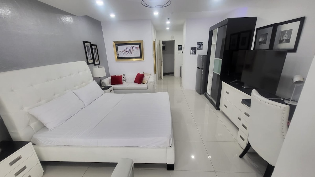 Angelic Premier Residences est assez proche de SM, de Korea town, des restaurants et des bars, mais assez loin pour ne pas être trop bruyant. L'immeuble dispose d'une salle de sport, d'une piscine sur le toit ouverte 24h/24 et d'un bar sportif avec une table de billard. Il y a un stationnement commun en face du condo sur la base du premier arrivé, premier servi + un stationnement supplémentaire de l'autre côté de la rue. Il s'agit d'un appartement entièrement équipé d'une chambre avec arrivée facile, 2 téléviseurs Netflix, Internet à fibre optique 200 Mbps, 1 lit king-size, un lit simple pliant et un canapé confortable!