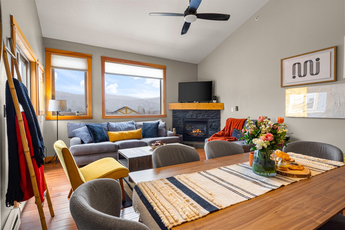 Offrez-vous un séjour dans un complexe hôtelier 5 étoiles et séjournez dans cette luxueuse suite penthouse en montagne avec une vue imprenable sur le coucher du soleil dans chaque pièce. Décorée dans le style Hygge et rehaussée d'art exotique, cette suite haut de gamme offre de hauts plafonds, des cheminées confortables, des téléviseurs intelligents et une ambiance relaxante de type spa. Le stationnement chauffé, la laveuse et la sécheuse dans l'appartement et le wifi haute vitesse sont inclus dans votre séjour. L'accès au gymnase et aux piscines est inclus. L'ascenseur fonctionne.